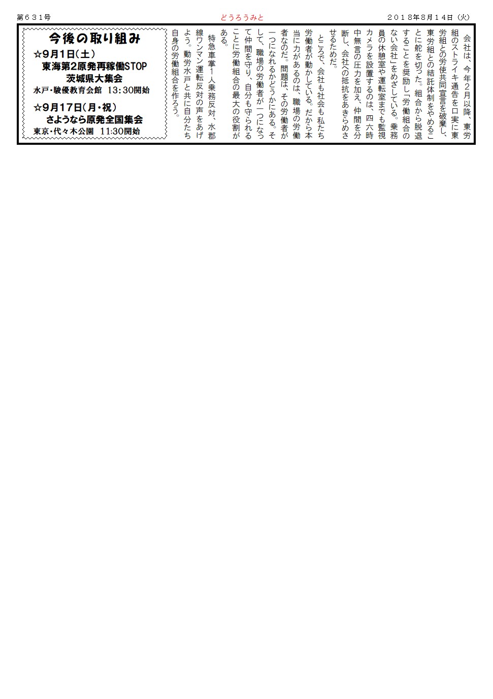 実際、昨年の4月1日、勝田運輸区の運転士2名が常磐線浪江延伸に反対してストライキに入ったが、勝田の仲間はこのストの代替運転を全員が拒否した。あわてた会社は、代替えを拒否した運転士を事情聴取したり、10月富岡延伸では本社の社長がわざわざ勝田運輸区に立ち寄り訓示したり、大わらわになったことを思い出そう。会社の際限のない合理化と安全無視を止める力は、実は職場の私たち自身にある。