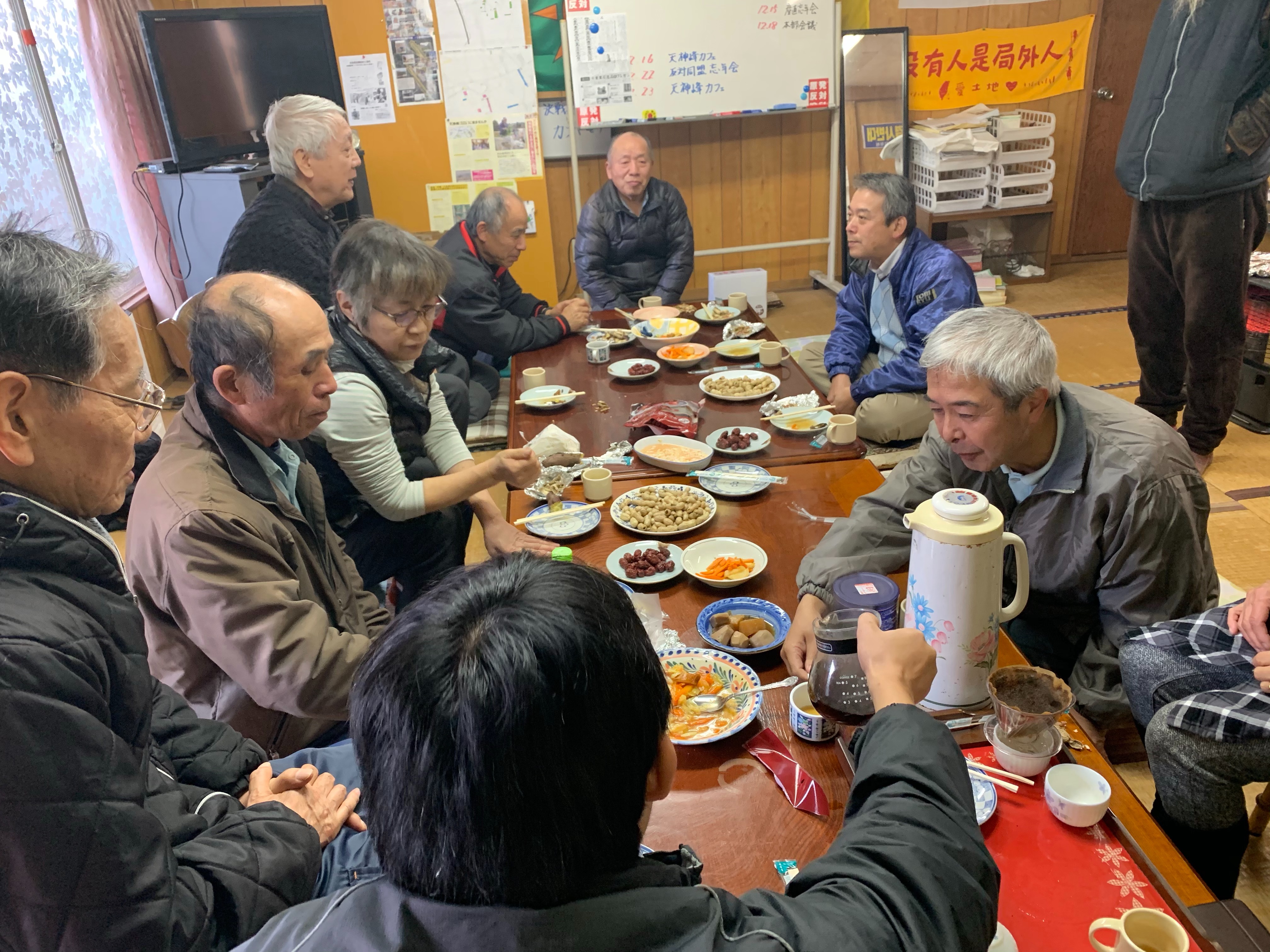 (補修した離れで市東さんの畑で取れた野菜を頂きながらの交流会。右手青いジャンパーが農民でもある木村書記長です。)第3滑走路の南側の地区では、反対同盟ではない住民が、建設反対を掲げて多くの看板が立てられています。芝山町の殿部(とのべ)地区では、地区の名前で看板が立てられています。
