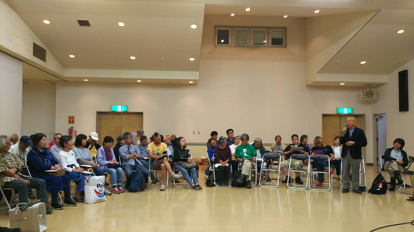 夕方大間に到着。早速集会へ。質問するいわきユニオン書記長西納さん。
