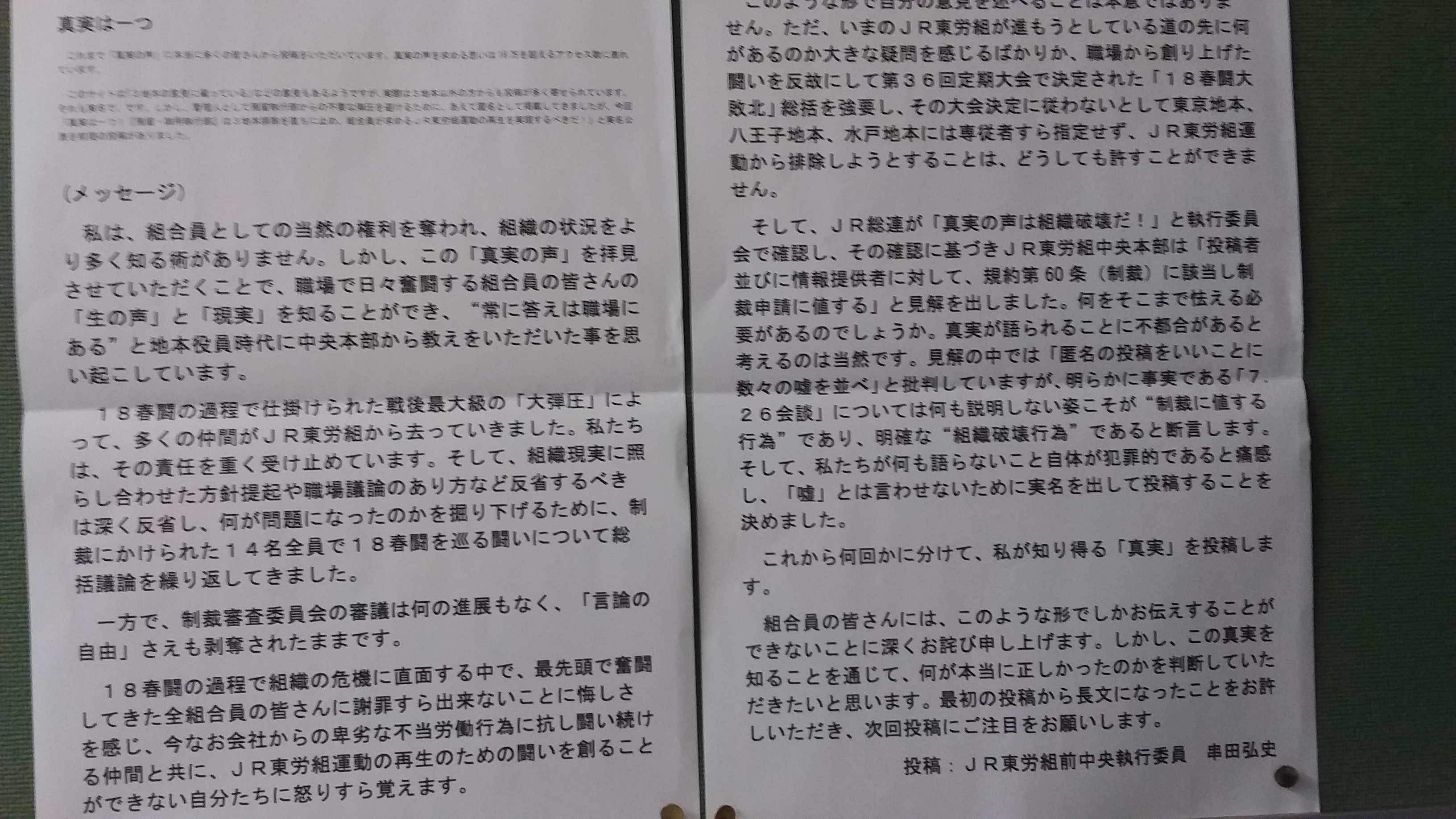 それに対して、水戸地本の串田弘史JR東労組前中央執行委員が、12月12日に「真実の声」に実名投稿しました。そして、水戸地本の掲示板に、一斉に張りだしたのです。