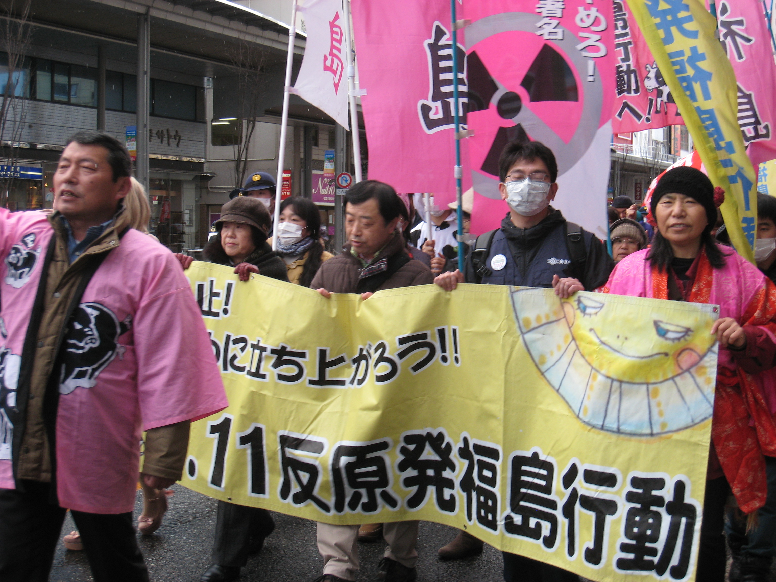 東日本大震災と福島第一原発事故から4年を迎える3月11日、福島・郡山市にて開催された「反原発福島行動15」に参加しました。 集会前の郡山駅前プレイベント。 息の合った歌と演奏で盛り上げました! 集会ではいわき在住の組合員と青年組合員が発言。 すべての原発の廃止と被曝から労働者・住民を守るため共に闘おうとデモ行進で訴えました。 駅前でのアピールでは、命と安全、地方を切り捨てる3・14JRダイ改と闘おうと渾身の訴えを発しました。