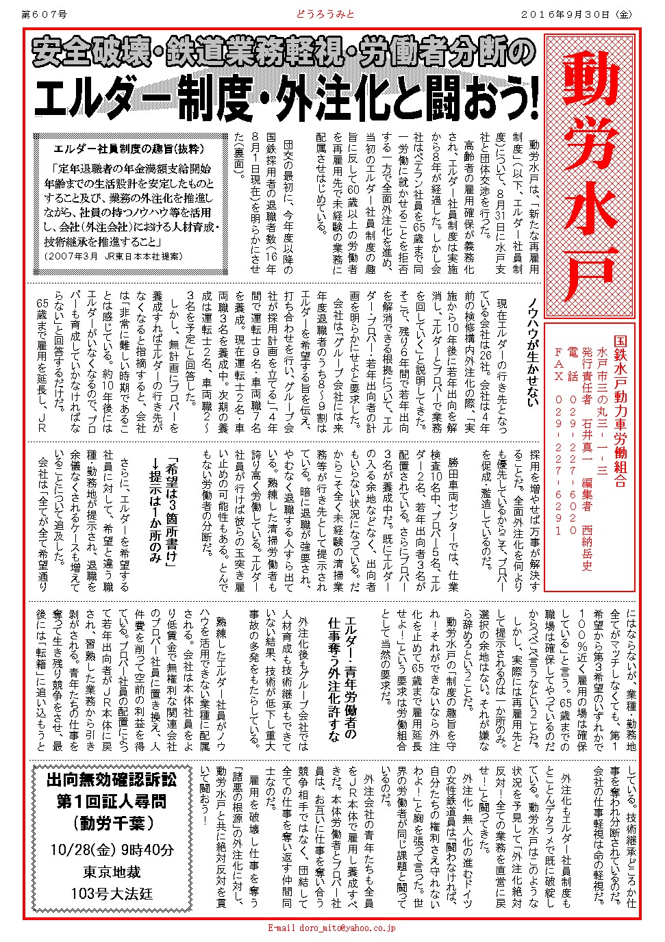 外注化もエルダー社員制度もとことんデタラメで既に破綻している。動労水戸はこのような状況を予見して「外注化絶対反対!全ての業務を直営に戻せ!」と闘ってきた。