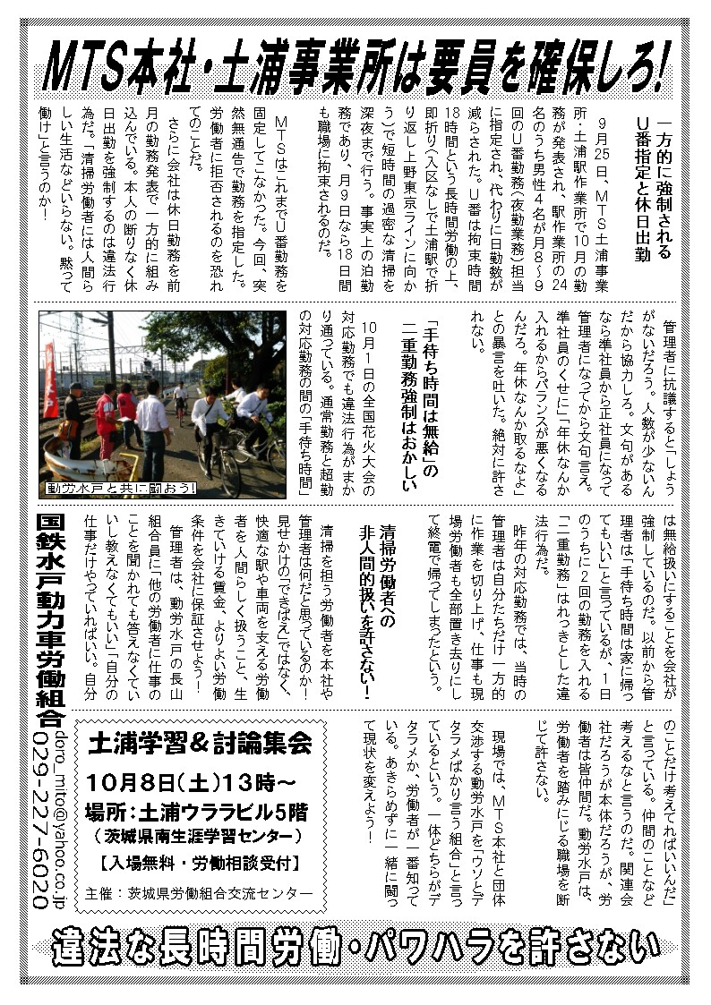 9月25日、MTS土浦事業所・土浦駅作業所で10月の勤務が発表され、駅作業所の24名のうち男性4名が月8~9回のU番勤務(夜勤業務)担当に指定され、代わりに日勤数が減らされた。U番は拘束時間18時間という長時間労働の上、即折り(入区なしで土浦駅で折り返し上野東京ラインに向かう)で短時間の過密な清掃を深夜まで行う。事実上の泊勤務であり、月9日なら18日間も職場に拘束されるのだ。