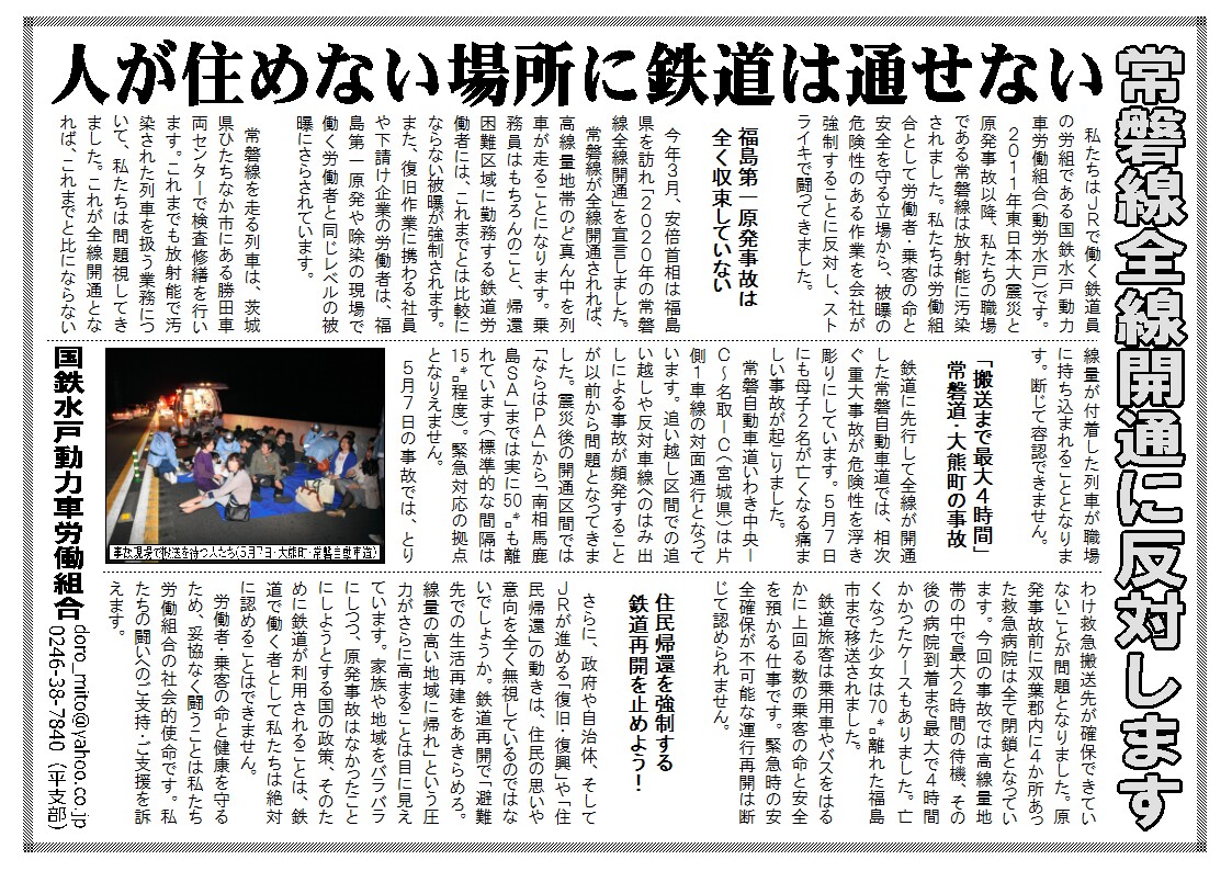 家族や地域をバラバラにしつつ、原発事故はなかったことにしようとする国の政策、そのために鉄道が利用されることは、鉄道で働く者として私たちは絶対に認めることはできません。