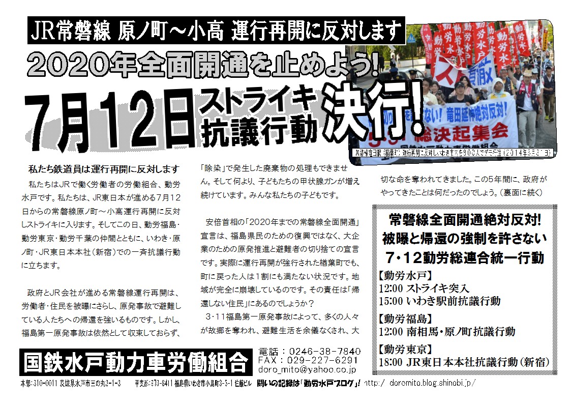 私たちはJRで働く労働者の労働組合、動労水戸です。私たちは、JR東日本が進める7月12日からの常磐線原ノ町~小高運行再開に反対しストライキに入ります。