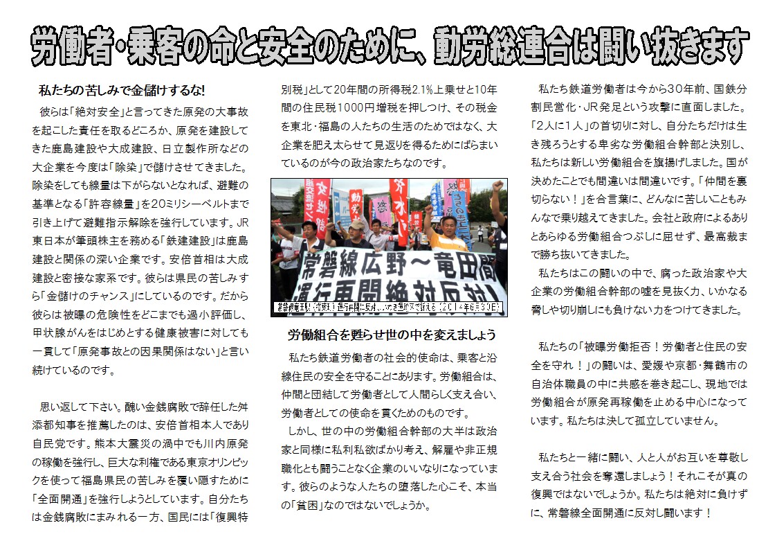 こうした外注化・非正規雇用化や、7月からの常磐線原ノ町~小高運行再開という被曝の強制と一切闘わずに、動労水戸や動労総連合を敵視する労働組合やその活動とは一体何のためにあるのでしょうか?むしろ同じ労働者として一緒になって闘う事が必要な時です。