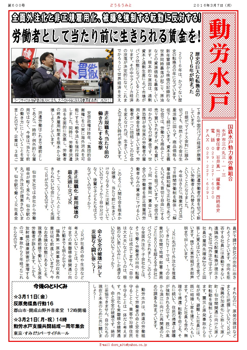 労働者が健康に働くためには、団結して労働環境を変えることが必要だ。昨年動労水戸の結集した青年労働者は、労働者として胸を張って生きていくために動労水戸に結集した。会社の横暴は労働者の団結した闘いで打ち破れる。職場の仲間と共に働き、共に生きていくために動労水戸に結集しよう!