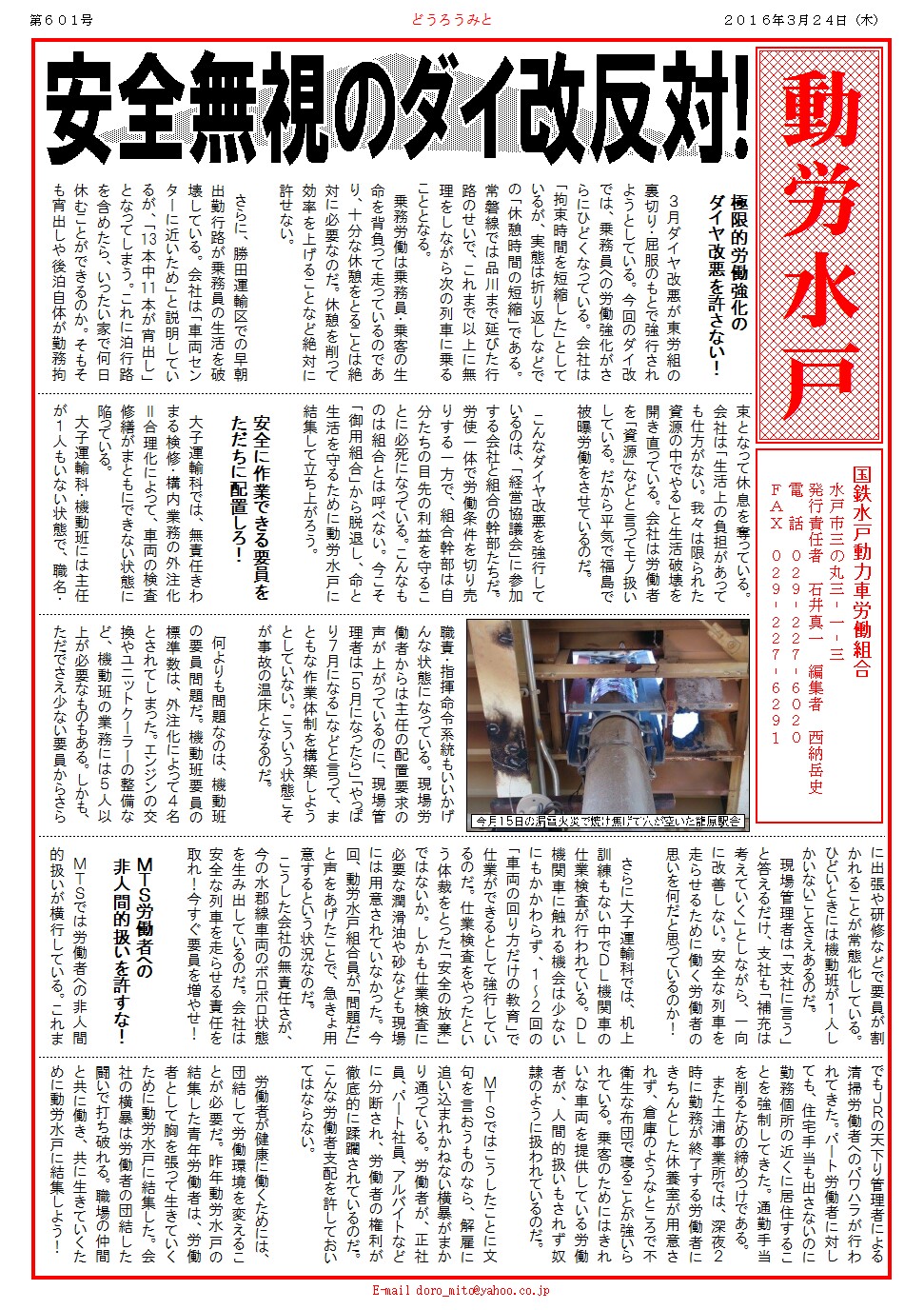 こんなダイヤ改悪を強行しているのは、「経営協議会」に参加する会社と組合の幹部たちだ。労使一体で労働条件を切り売りする一方で、組合幹部は自分たちの目先の利益を守ることに必死になっている。こんなものは組合とは呼べない。今こそ「御用組合」から脱退し、命と生活を守るために動労水戸に結集して立ち上がろう。