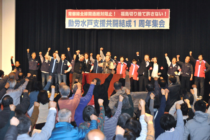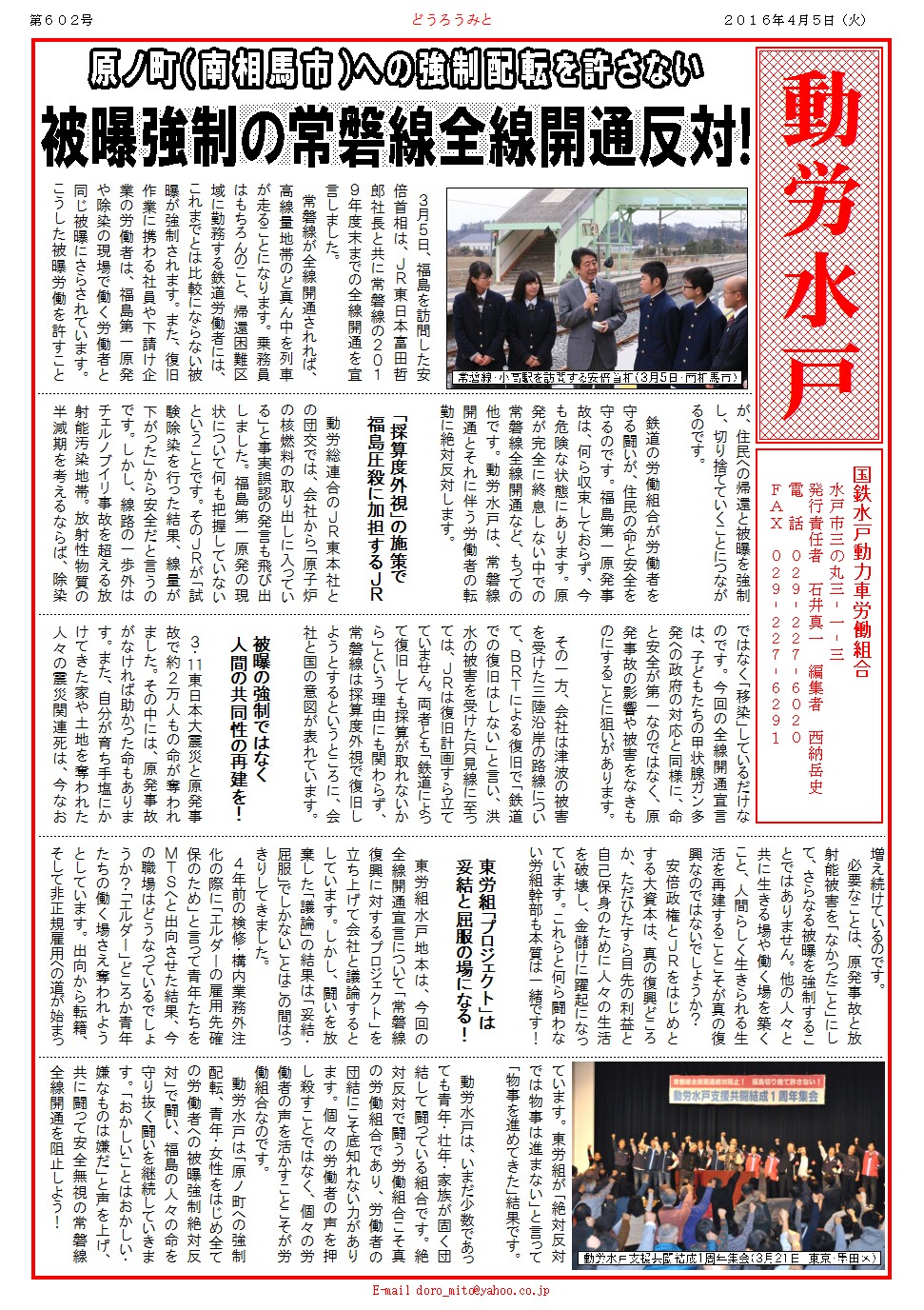 鉄道の労働組合が労働者を守る闘いが、住民の命と安全を守るのです。福島第一原発事故は、何ら収束しておらず、今も危険な状態にあります。原発が完全に終息しない中での常磐線全線開通など、もっての他です。動労水戸は、常磐線開通とそれに伴う労働者の転勤に絶対反対します。