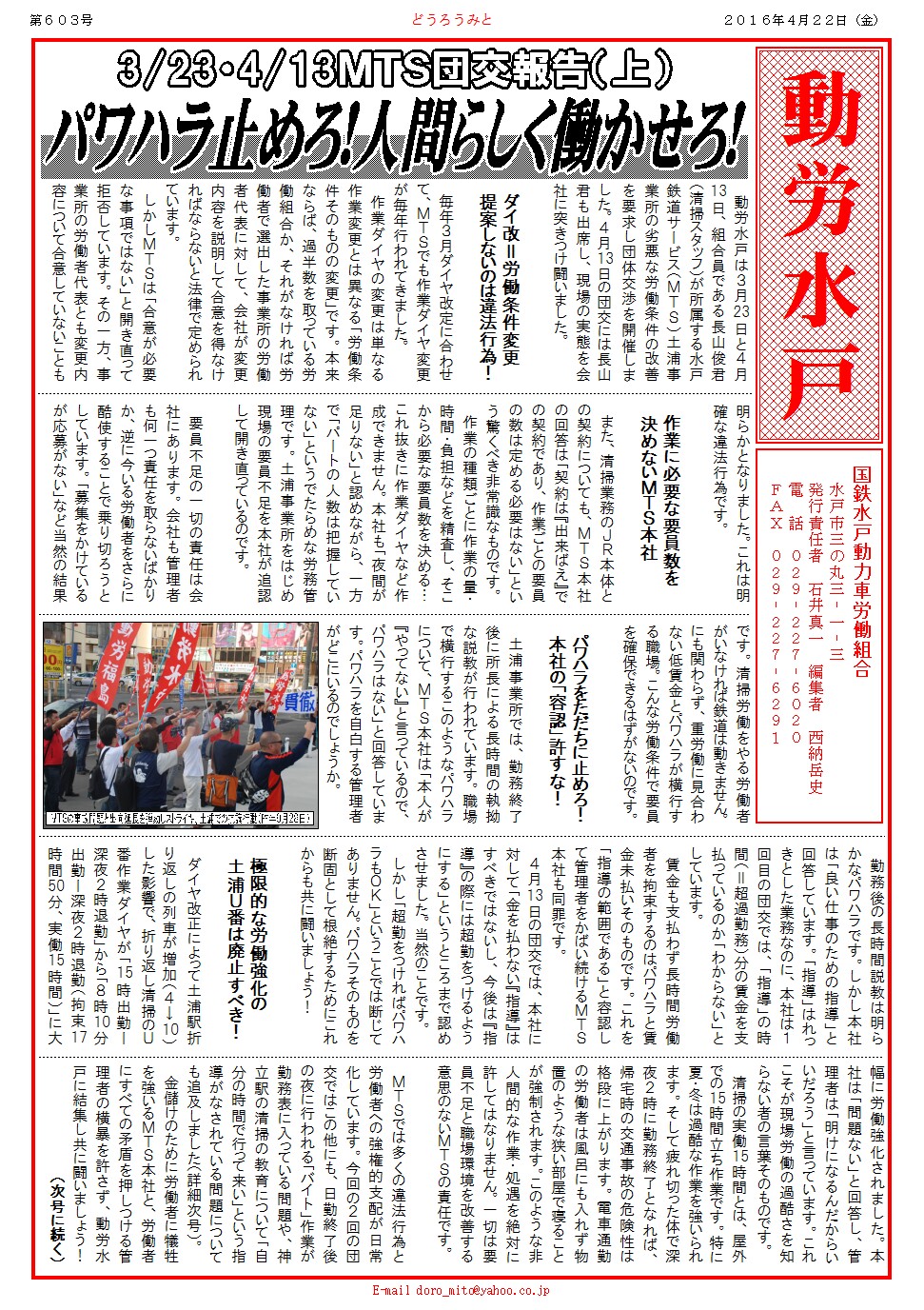 金儲けのために労働者に犠牲を強いるMTS本社と、労働者にすべての矛盾を押しつける管理者の横暴を許さず、動労水戸に結集し共に闘いましょう!