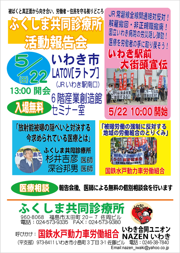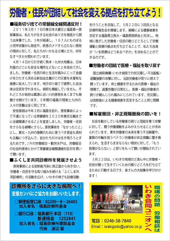 原発事故による放射能汚染に真正面から向き合い、労働者・住民を守る取り組みを続ける「ふくしま共同診療所」の活動を広げ、いわきの地でも診療活動を行うことを目指して、5月22日に3回目となる診療所報告会を開催します。被曝による健康被害を否定する福島県立医大・福島県医師会と対決し、地域に根ざした労働者・住民の拠りどころとして労働運動と医療の拠点を打ち立てることで、私たち自身が「いま医療はどうあるべきか」を決めることができるのです。