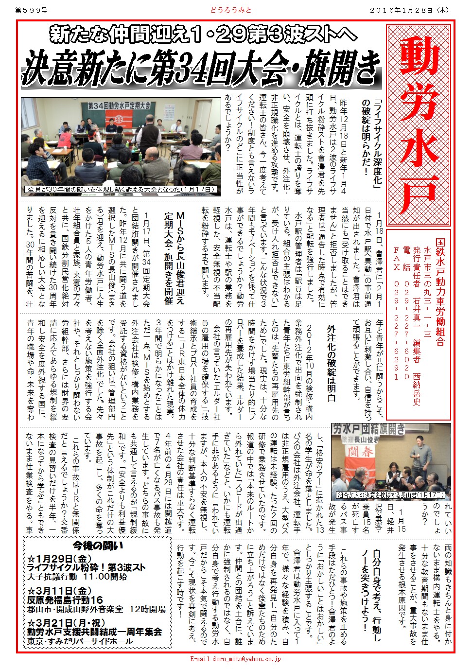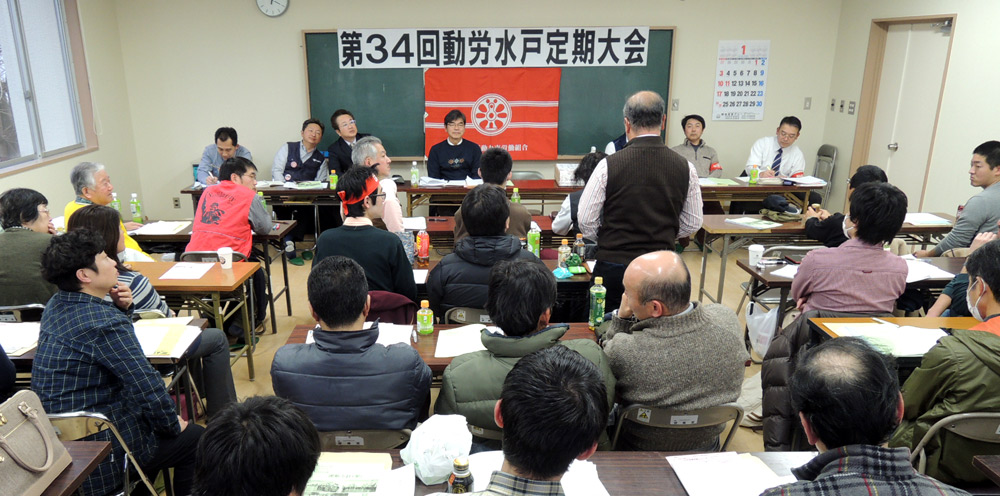 1月17日、第34回定期大会と団結旗開きが開催されました。昨年12月に共に闘う道を選択したMTSの長山俊(まさる)君を迎え、動労水戸に人生をかけた5人の青年労働者、壮年組合員と家族、来賓の方々と共に、国鉄分割民営化絶対反対を貫き闘い続けた30周年を迎えるに相応しい大会となりました。30年間の苦闘を、壮年と青年が共に闘うからこそ、お互いに刺激し合い、自信を持って頑張ることができます。