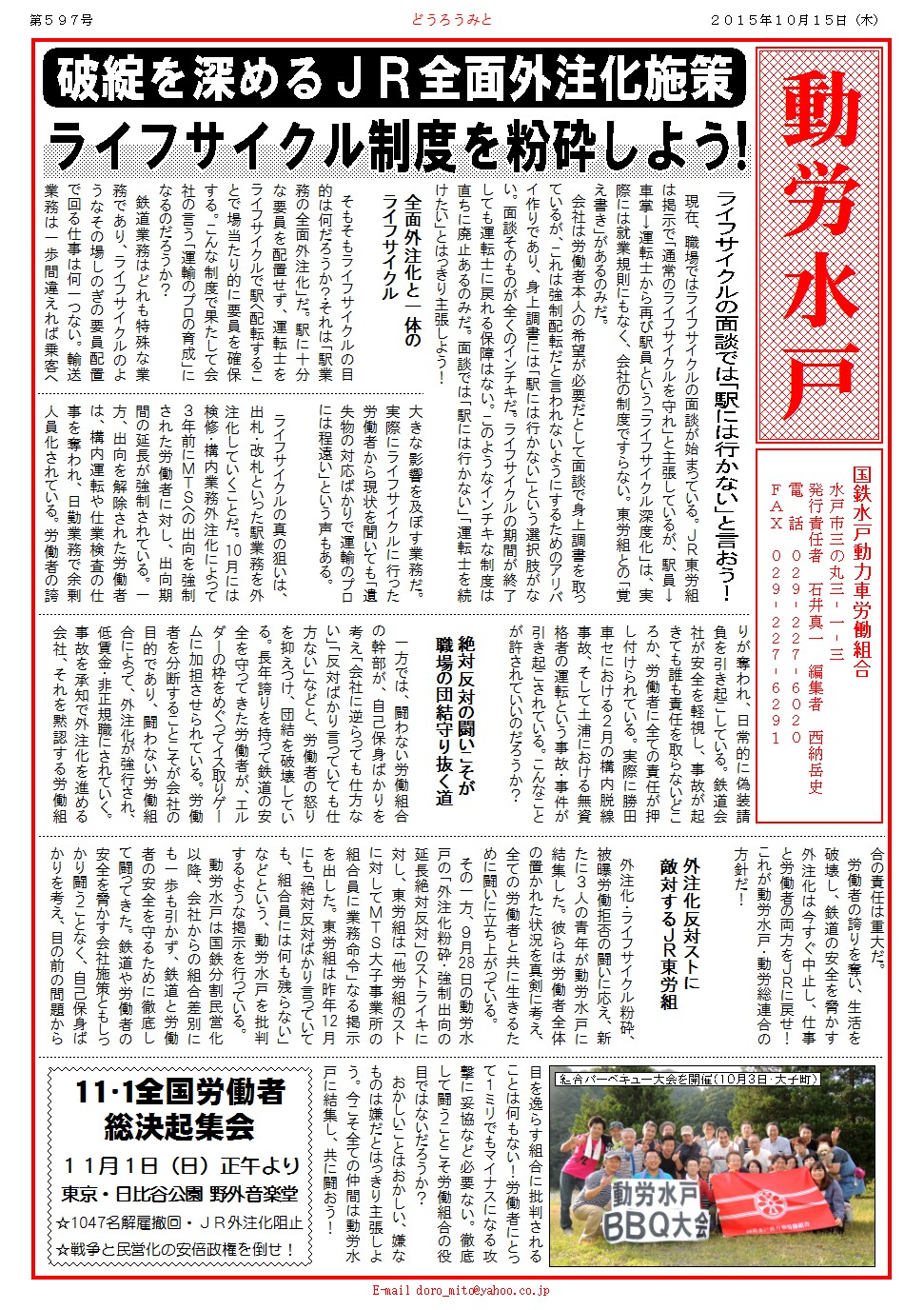 駅外注化を進めるJRは、ついに秋葉原駅まで全面外注化しようとしている。全駅が外注化されれば、乗務員の養成もできなくなる。その先には車掌・運転士の外注化が待っている。ライフサイクルに従う事は、自分たちと後輩たちの未来の破壊に通じている。動労水戸と動労総連合は、このような会社の施策を絶対に認めない。