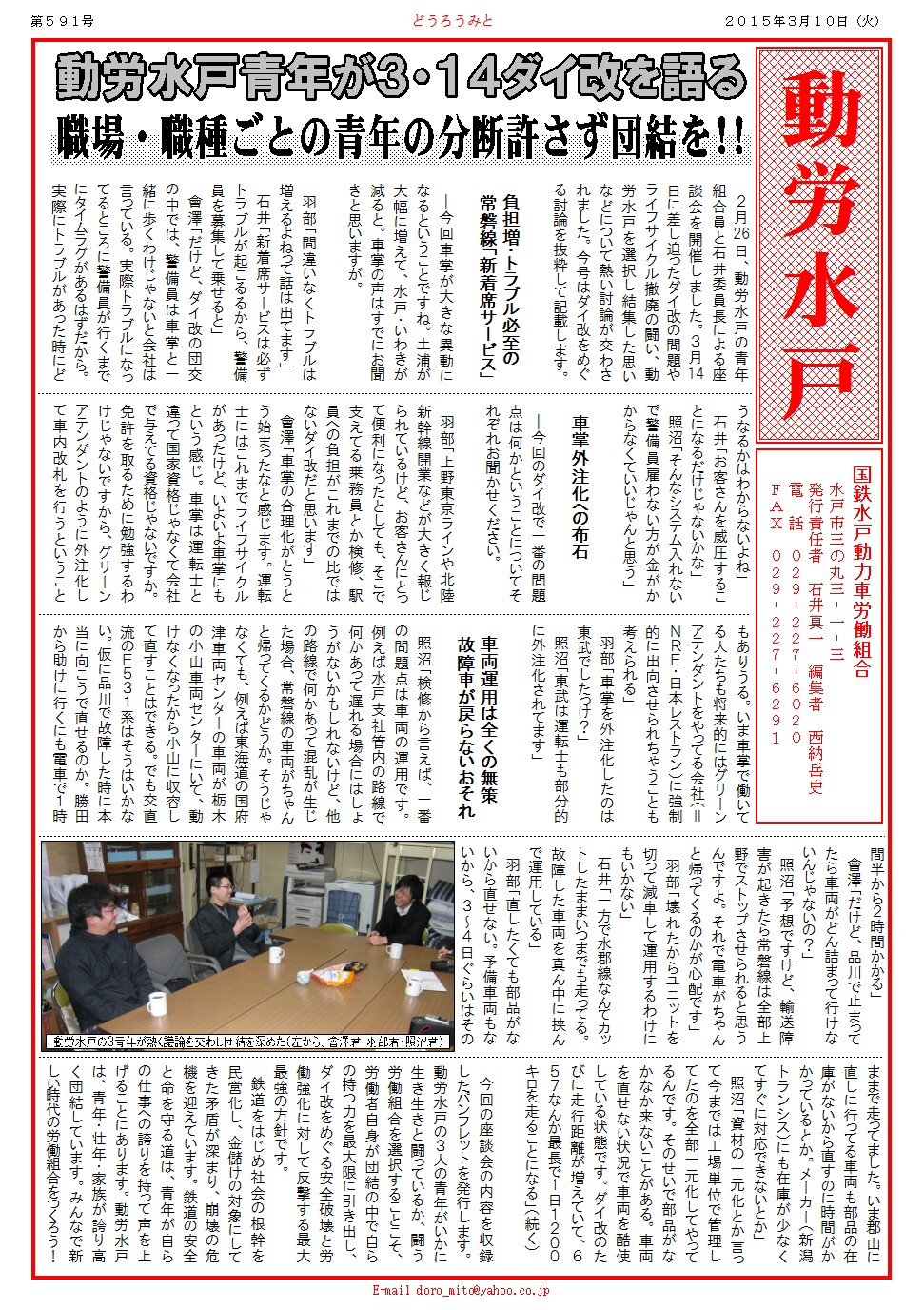 2月26日、動労水戸の青年組合員と石井委員長による座談会を開催しました。3月14日に差し迫ったダイ改の問題やライフサイクル撤廃の闘い、動労水戸を選択し結集した思いなどについて熱い討論が交わされました。今号はダイ改をめぐる討論を抜粋して記載します。