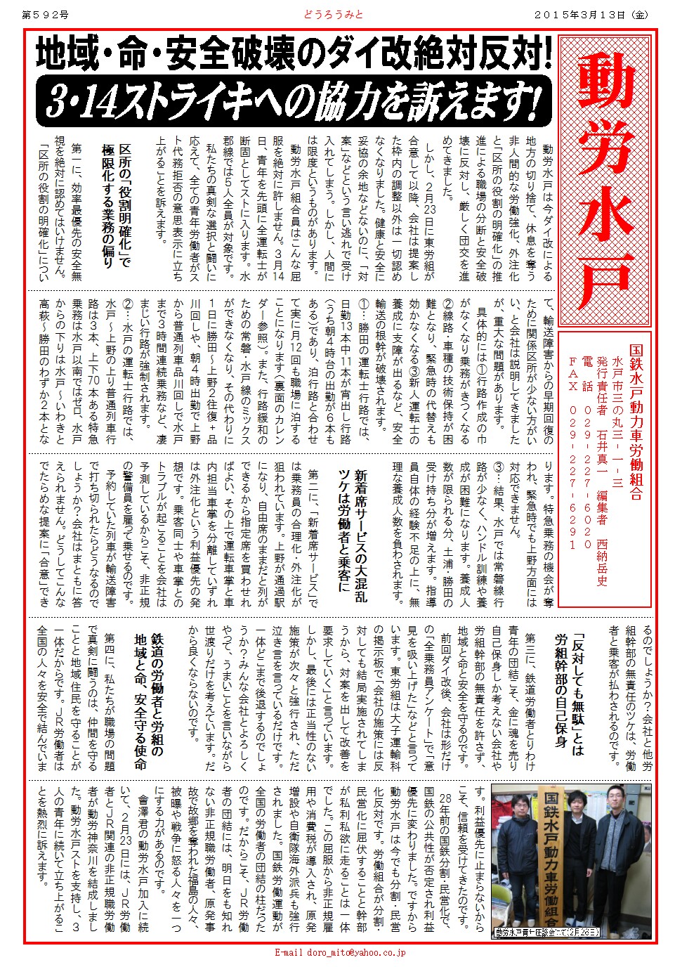 會澤君の動労水戸加入に続いて、2月23日には、JR労働者とJR関連の非正規職労働者が動労神奈川を結成しました。動労水戸ストを支持し、3人の青年に続いて立ち上がることを熱烈に訴えます。