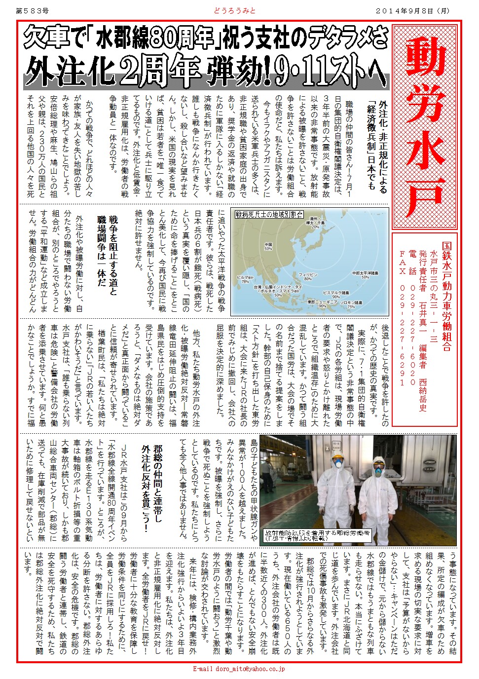 他方、私たち動労水戸の外注化・被曝労働絶対反対―常磐線竜田延伸阻止の闘いは、福島県民をはじめ圧倒的支持を受けています。会社の施策であろうと、「ダメなものは絶対ダメだ」と真正面から闘っていることに信頼が寄せられています。
