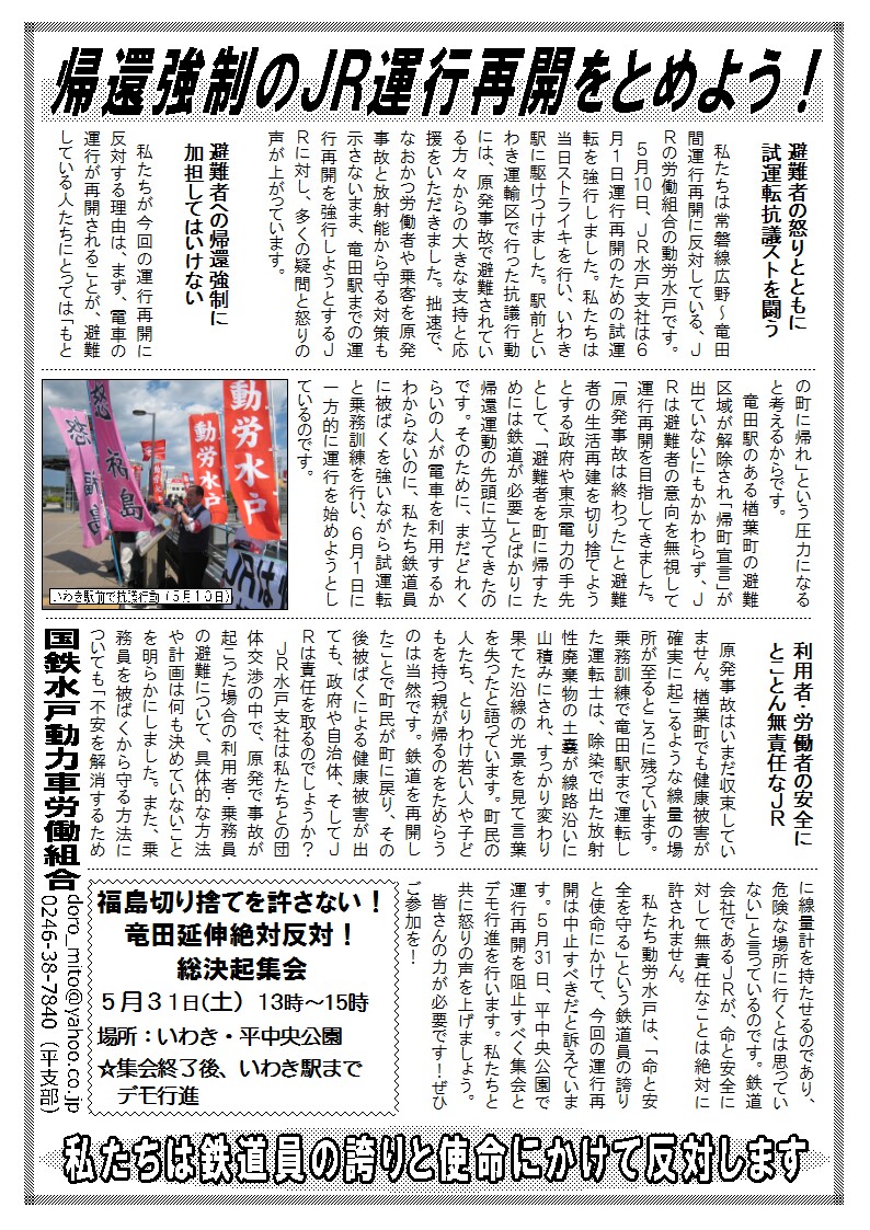 JRで働く仲間と利用者・住民、とりわけいわき運輸区で働く仲間を原発事故と被ばくの危険から守るために、私たちのストへの協力を心底訴えます。