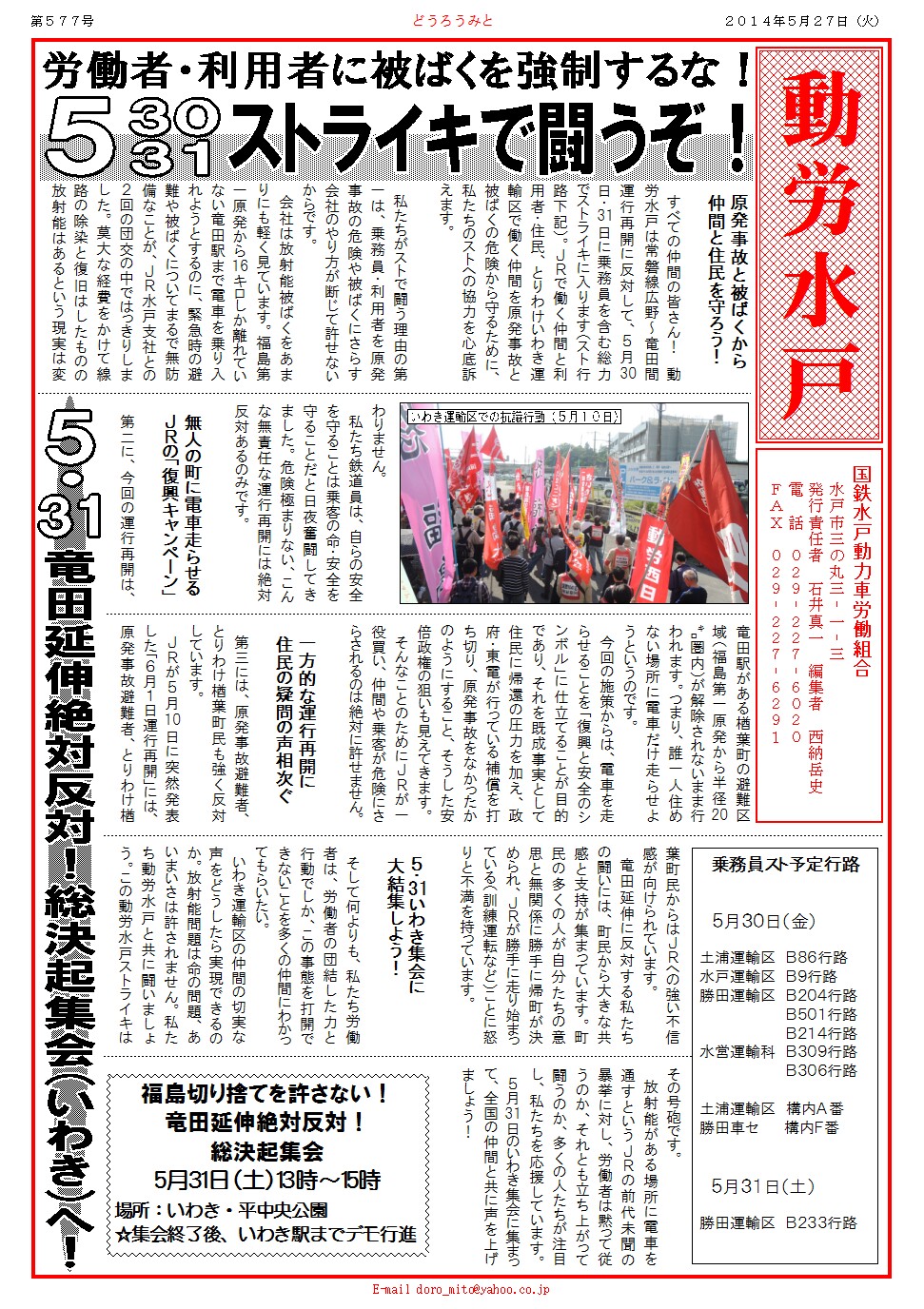 すべての仲間の皆さん!動労水戸は常磐線広野~竜田間運行再開に反対して、5月30日・31日に乗務員を含む総力でストライキに入ります(スト行路下記)。