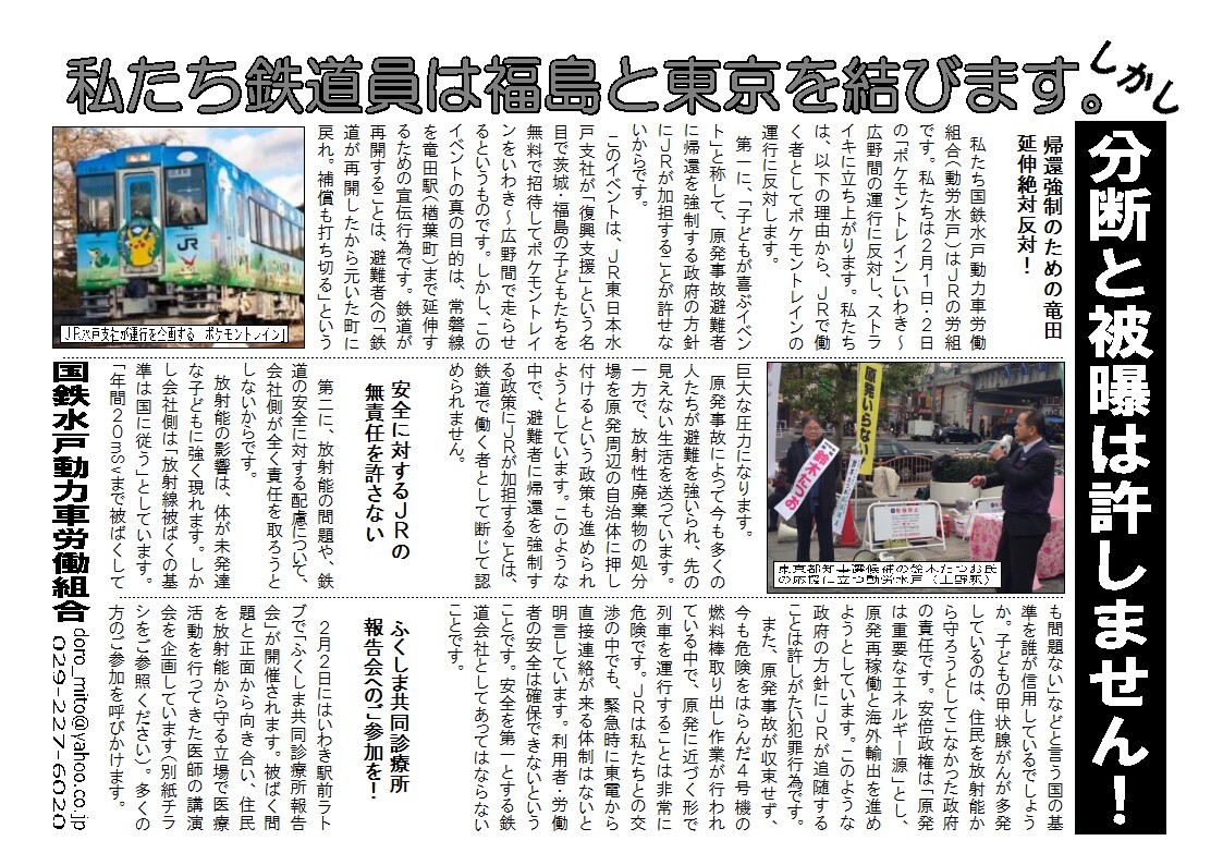 ビラでは併せて、2月23日にいわきで行われる「怒りのいわき行動」と3月11日の「反原発福島行動'14(郡山市)」の要綱も掲載しています。