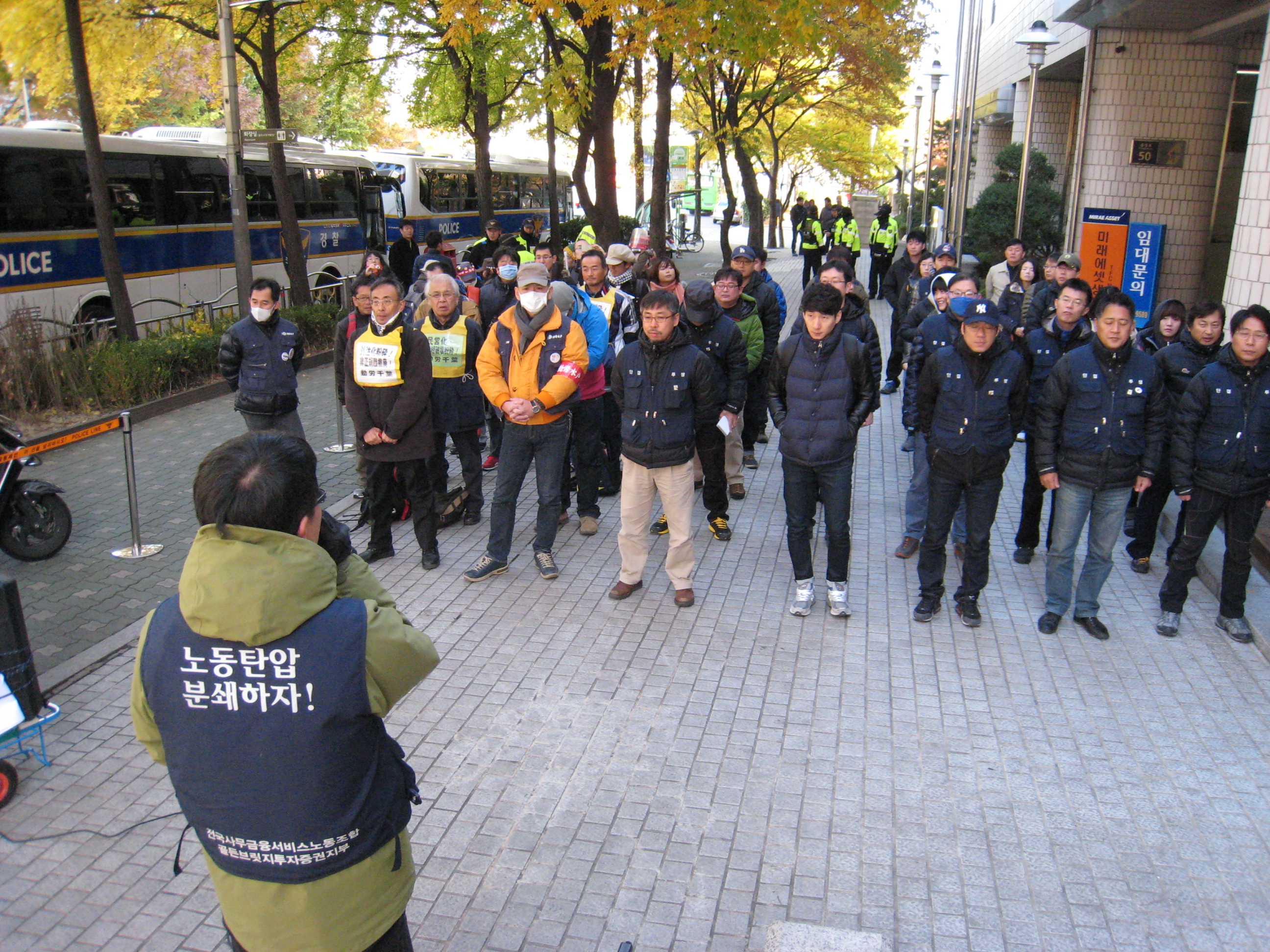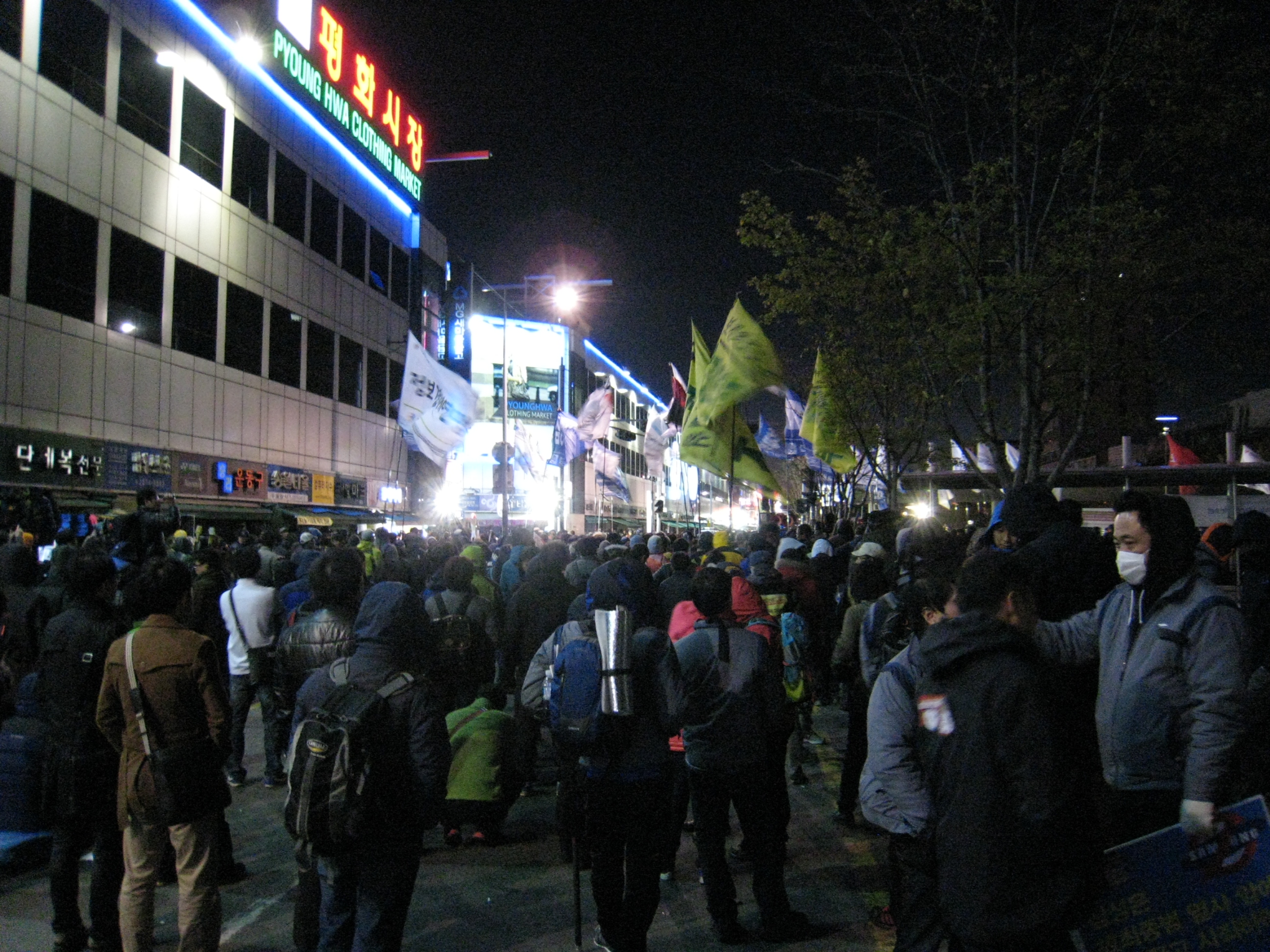 デモは警察の定めた解散地点を越え、そこからさらに2倍近くの距離を行進し、韓国労働運動にとって象徴的な地であるチョンテイル橋に到着して集約集会を行いました。
