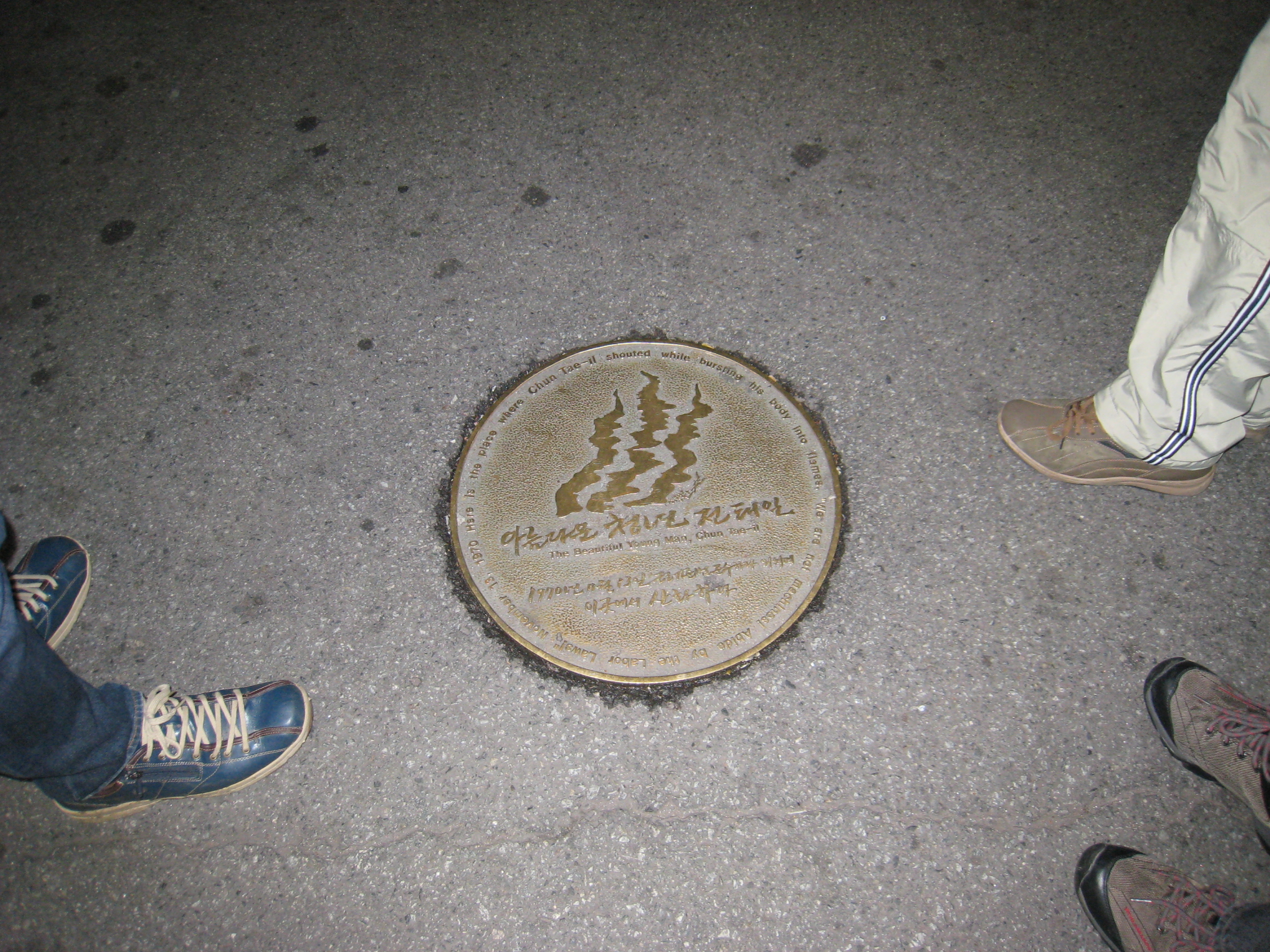 ↑チョンテイル青年が繊維工場の2階で体に火をつけ、この場所まで下りてきて倒れたことを示すプレート。