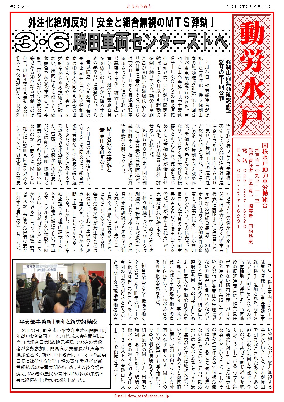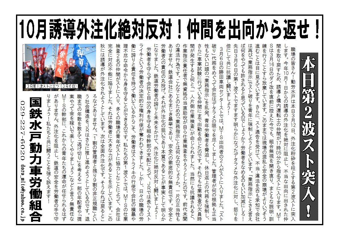 組合員の皆さん!職場で働く全ての皆さん!昨年の10・1外注化以降起こったこと、そして今回の団交で明らかとなったことは、MTSは現場労働者の思いや組合など平然と無視する会社だということ、それが原因で引き起こされたありとあらゆる失敗から何も学ばず、今度のダイ改でも同じ過ちを繰り返そうとしている、つまり鉄道業務に対してとことん無責任な会社だということ、そしてその痛みや責任を全て現場労働者に負わせることを何とも思わない会社だということだ。動労水戸はこのようなデタラメと安全無視の外注化に絶対反対だ。いかなることがあろうと徹底的に闘い、強制出向させられた仲間を必ず取り戻す。MTSの全ての労働者とも固く団結し、安全で明るい職場をつくろう!組合無視のMTSと、出向を強制するJRに対し、現場労働者全員の怒りを叩きつけよう!3・6ストを突破口に、ストライキを復権させよう!