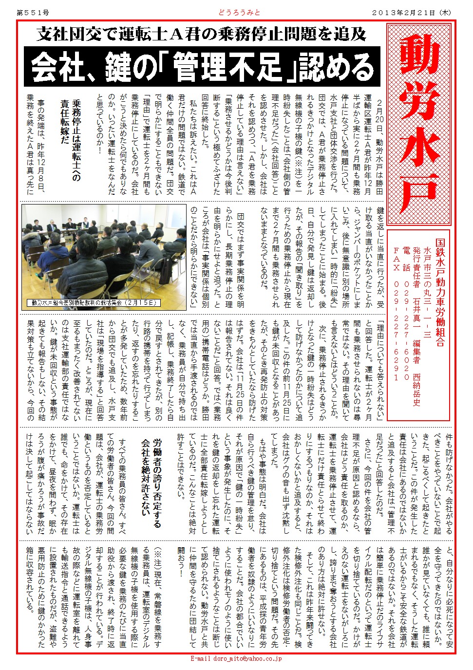 2月20日、動労水戸は勝田運輸区運転士A君が昨年12月半ばから実に2ヶ月間も乗務停止になっている問題について、水戸支社と団体交渉を行った。団交では、A君が乗務停止されるきっかけとなったデジタル無線機の子機の鍵(※注)を一時紛失したことは「会社側の管理不足だった」(会社回答)ことを認めさせた。しかし、会社はそれを認めつつ、「A君を乗務停止している理由は言えない」「乗務させるかどうかは今後判断する」という極めてふざけた回答に終始した。