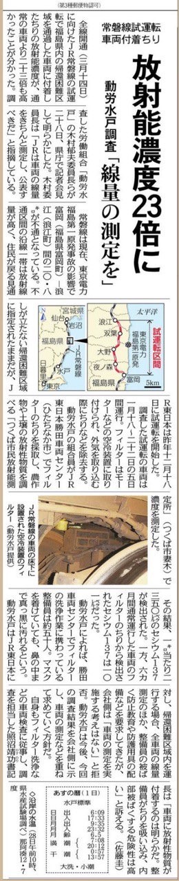 もう一方で安倍首相は、福島第一原発事故からの復興をアピールするために、常磐線を全線開通させようとしています。JR東日本はこの意向を受けて、3月ダイヤ改正で人の住めない地域に列車を走らせようとしています。