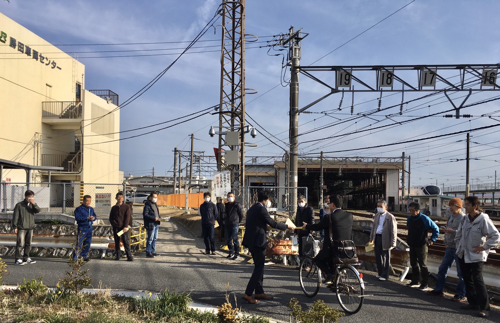 朝7時半からは、車両センターの組合員総出でビラ配布を行ないました。出勤してきた労働者は、職場の仲間が差し出すビラを、言葉を交わしながら受け取ってくれました。