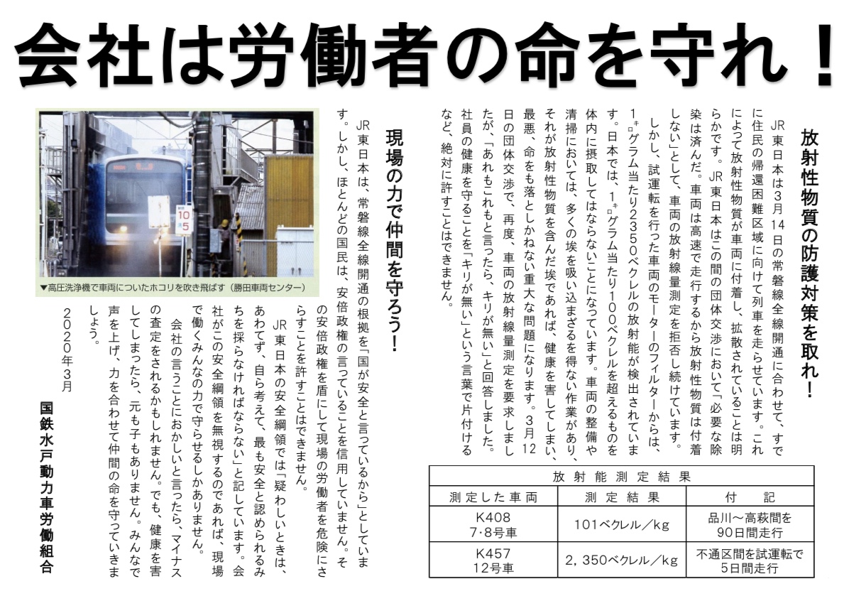新型コロナウィルス対策も含めて、JRもグループ会社のMTSも、まともな防護対策をとっているとは思えません。こんな会社であるからこそ、現場労働者自らの声で労働者の安全を確保させなければならないと思います。労働者には安全に働く権利があり、会社は安全に働かせる義務があります。会社に言われたらそれで終わりではなく、「おかしいものはおかしい」の声を、職場の当たり前のことにしていけたらと思います。そういう声を、すべての職場に広げていきましょう。動労水戸はそのために、会社に何度でも要求を突きつけていきます。みんなで命を守らせましょう。