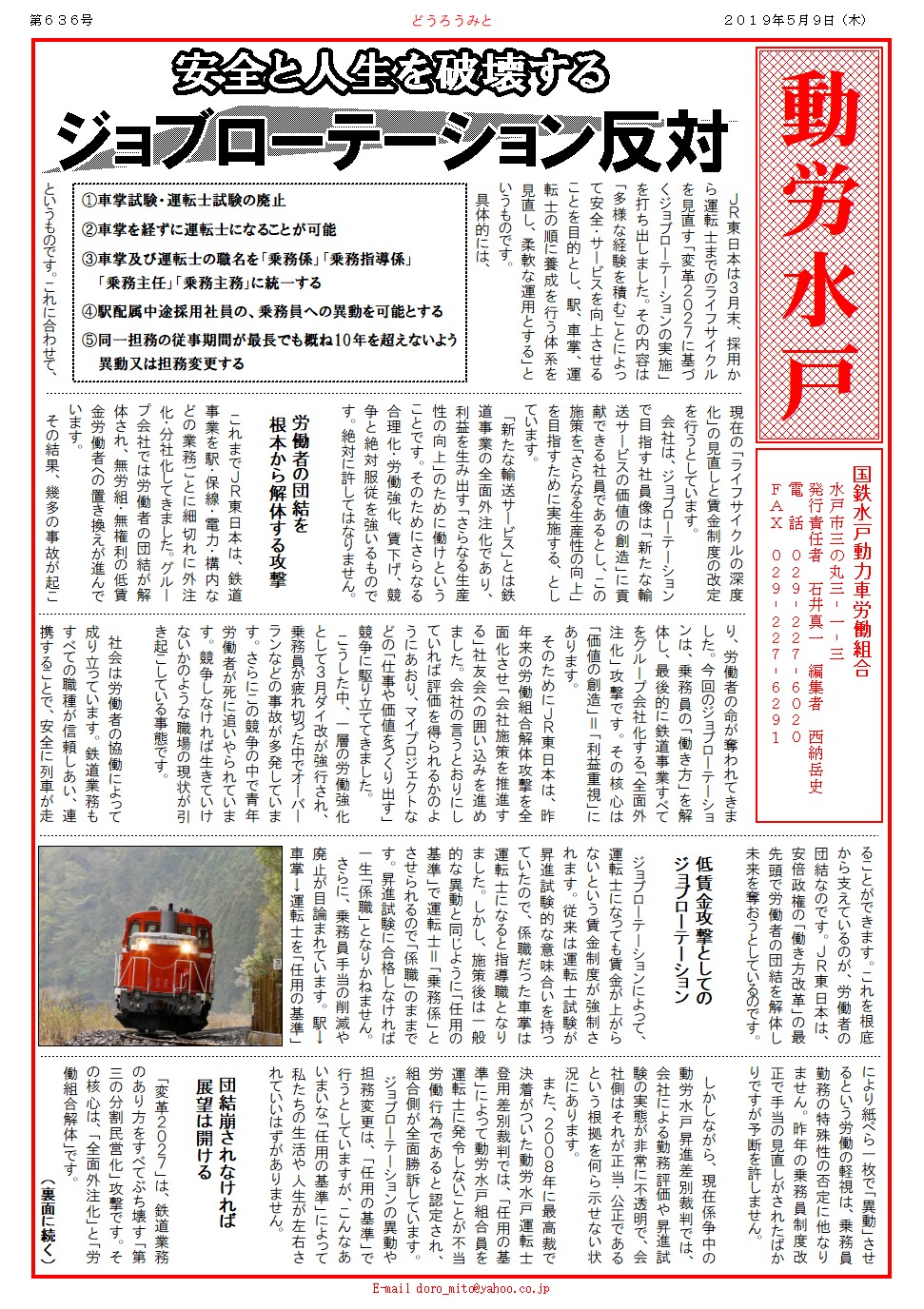 この民営化攻撃に唯一立ち向かってきたのが、動労千葉労働運動です。現場労働者の団結を信頼し「団結さえ崩されなければ展望は開ける」として、JR東日本の組合差別、外注化攻撃と闘い抜いてきました。私たち動労水戸も、動労千葉と一体となって、JR東日本の組合解体攻撃と闘い抜いてきました。