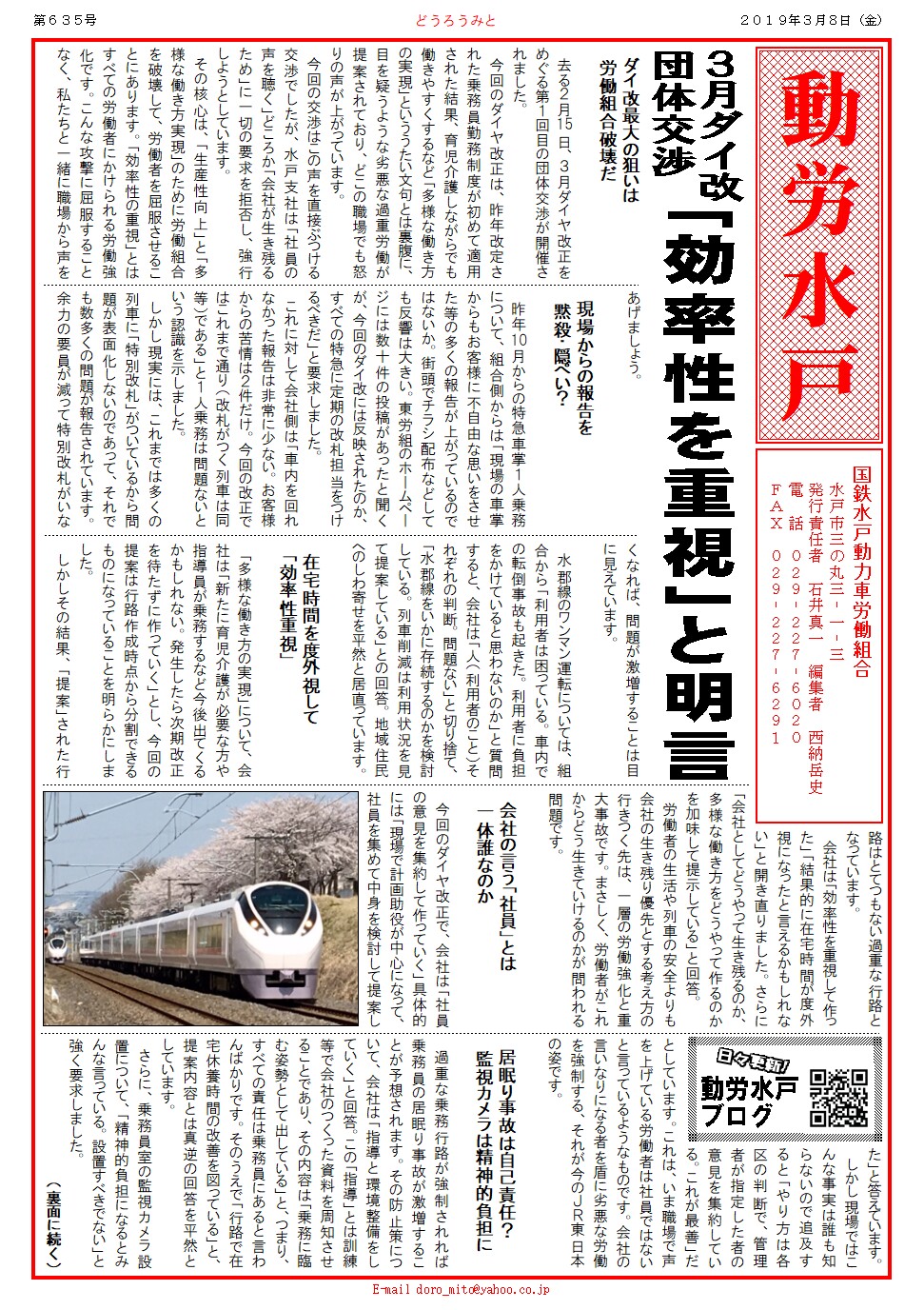 水郡線のワンマン運転については、組合から「利用者は困っている。車内での転倒事故も起きた。利用者に負担をかけていると思わないのか」と質問すると、会社は「人(利用者のこと)それぞれの判断。問題ない」と切り捨て、「水郡線をいかに存続するのかを検討している。列車削減は利用状況を見て提案している」との回答。地域住民へのしわ寄せを平然と居直っています。