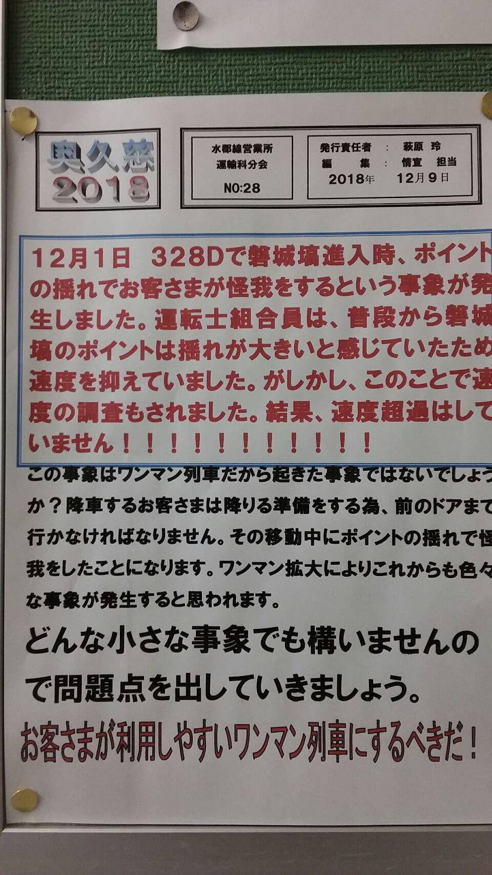 効率だけではなく、乗客の安全を確保して始めて、列車の安全と言えることを痛感しています。