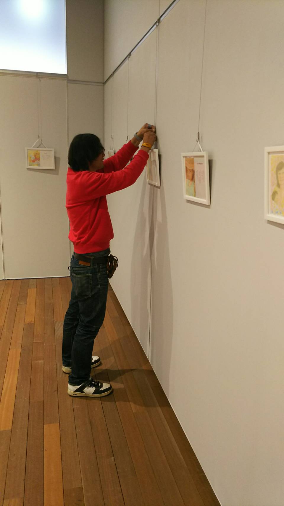 中では青年がメジャーで計りながら、丁寧に展示していました。