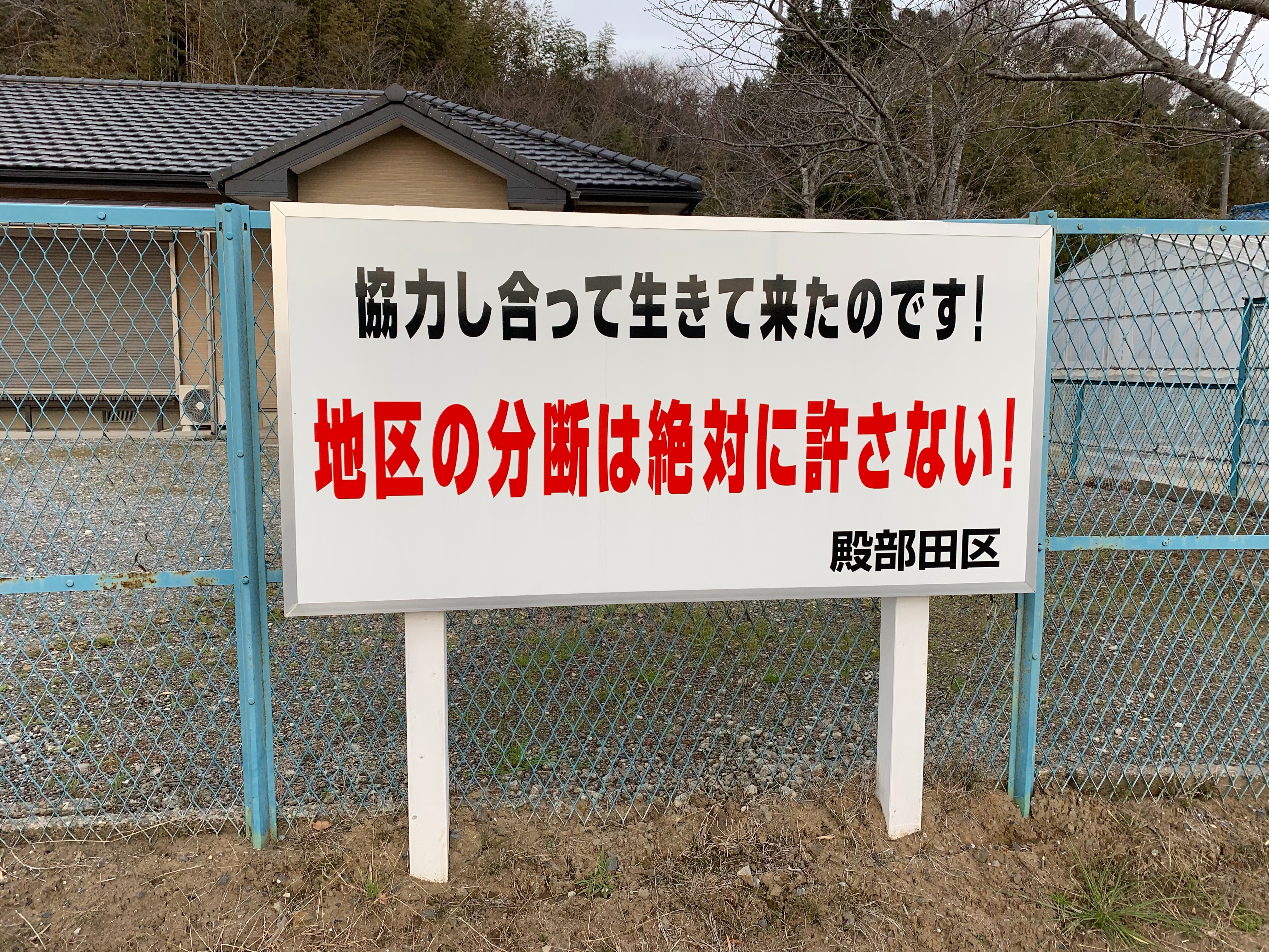 (補修した離れで市東さんの畑で取れた野菜を頂きながらの交流会。右手青いジャンパーが農民でもある木村書記長です。)第3滑走路の南側の地区では、反対同盟ではない住民が、建設反対を掲げて多くの看板が立てられています。芝山町の殿部(とのべ)地区では、地区の名前で看板が立てられています。