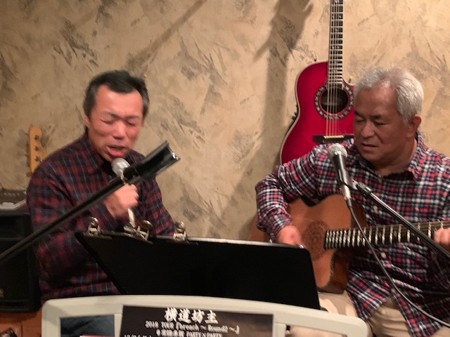 ライブ居酒屋で演奏するのは動労水戸OB会の川崎さん。子供会やスキー、音楽を通した地域の名士です。名産の「干し芋」作り最盛期ですが忘年会に来てくれました。