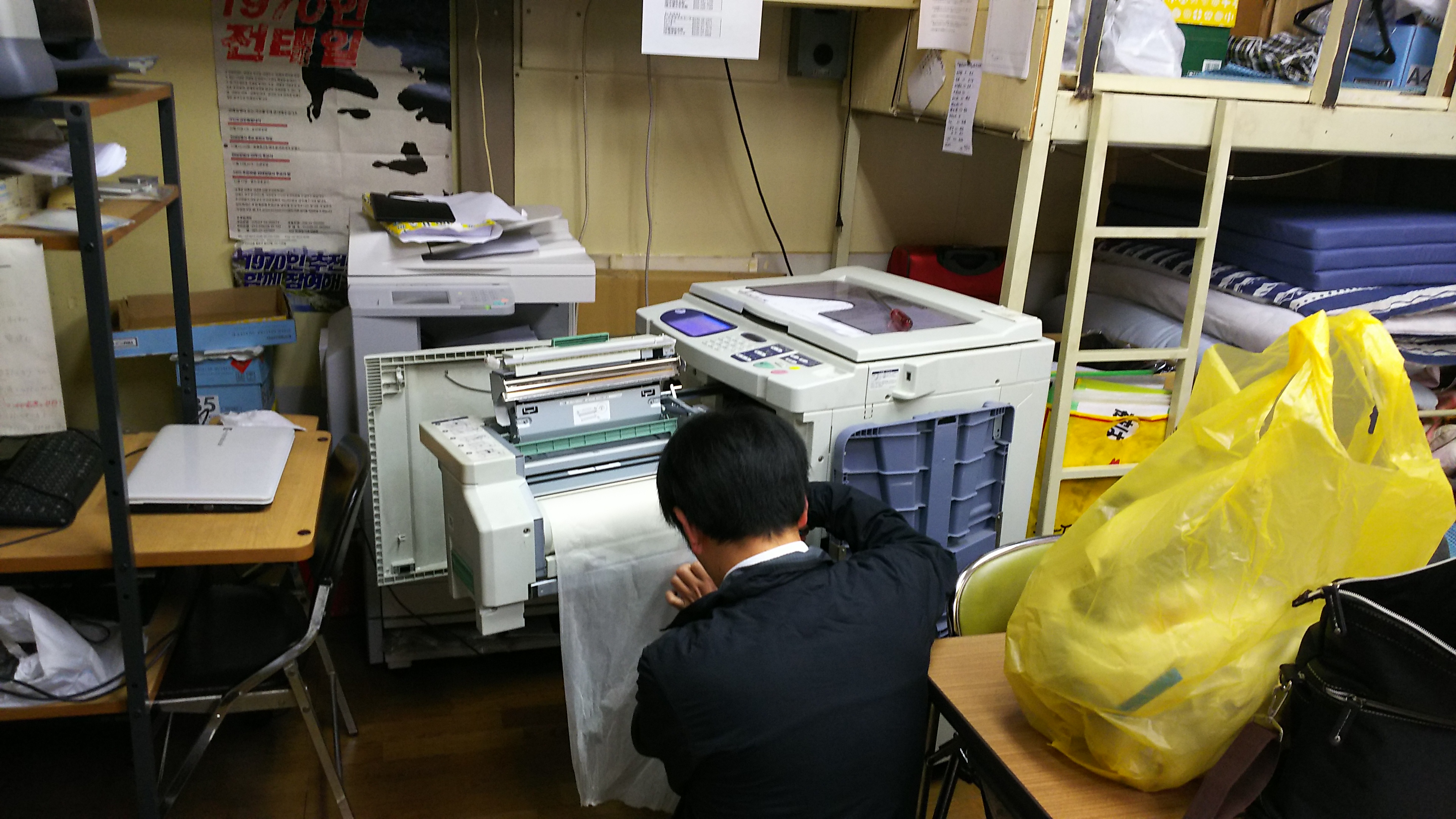 大会前なのに印刷機が故障。メンテナンスに来てもらい、作業中断。湿気に弱く、結露が原因らしいです。そう言えば電車故障にも結露故障があるなってのんきに考えながら立合いました。さすがにプロ、直ぐに直してくれました。