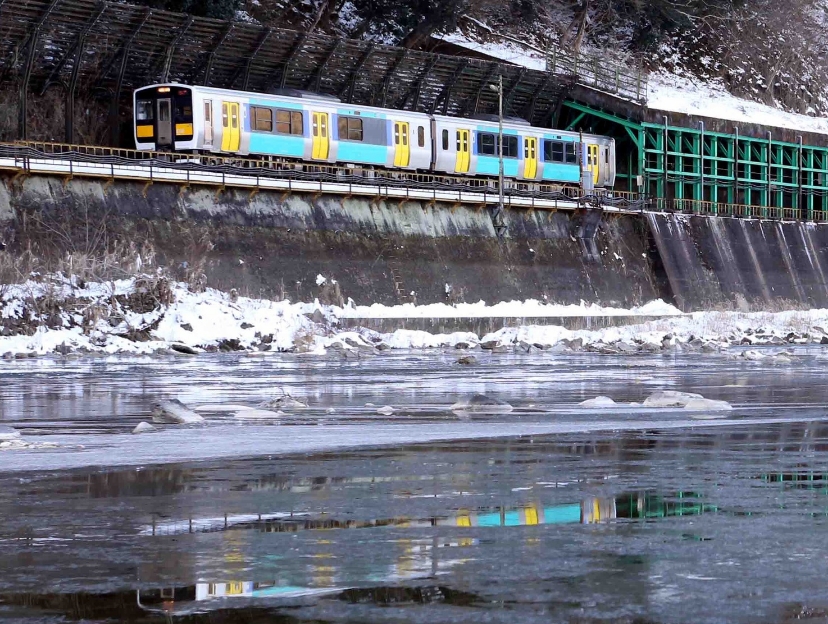 (久慈川の脇を通る水郡線。冬期に川を氷が流れる珍しい現象が起きます。氷花・シガと呼ばれます。とても寒いところです。)