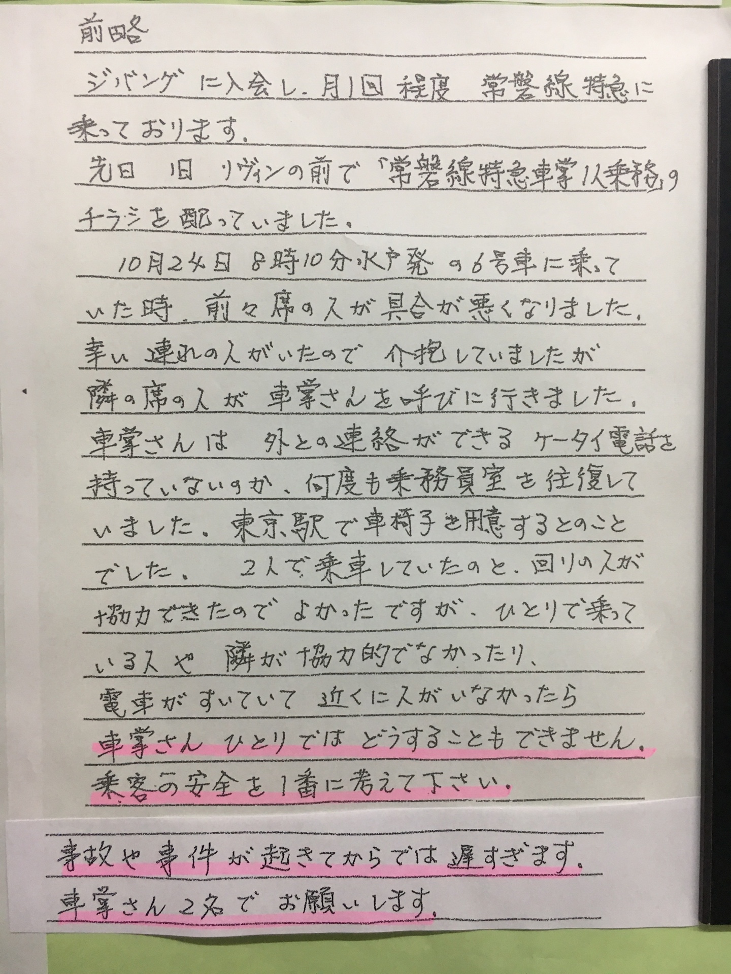 この間、車内はワンマン運転のために、乗客だけが取り残されている状況でした。以前から、ワンマン運転では何かあれば乗務員がいない状況になることを問題としてあげてきましたが、これを30分以上にわたって引き起こす事態となってしまいました。
