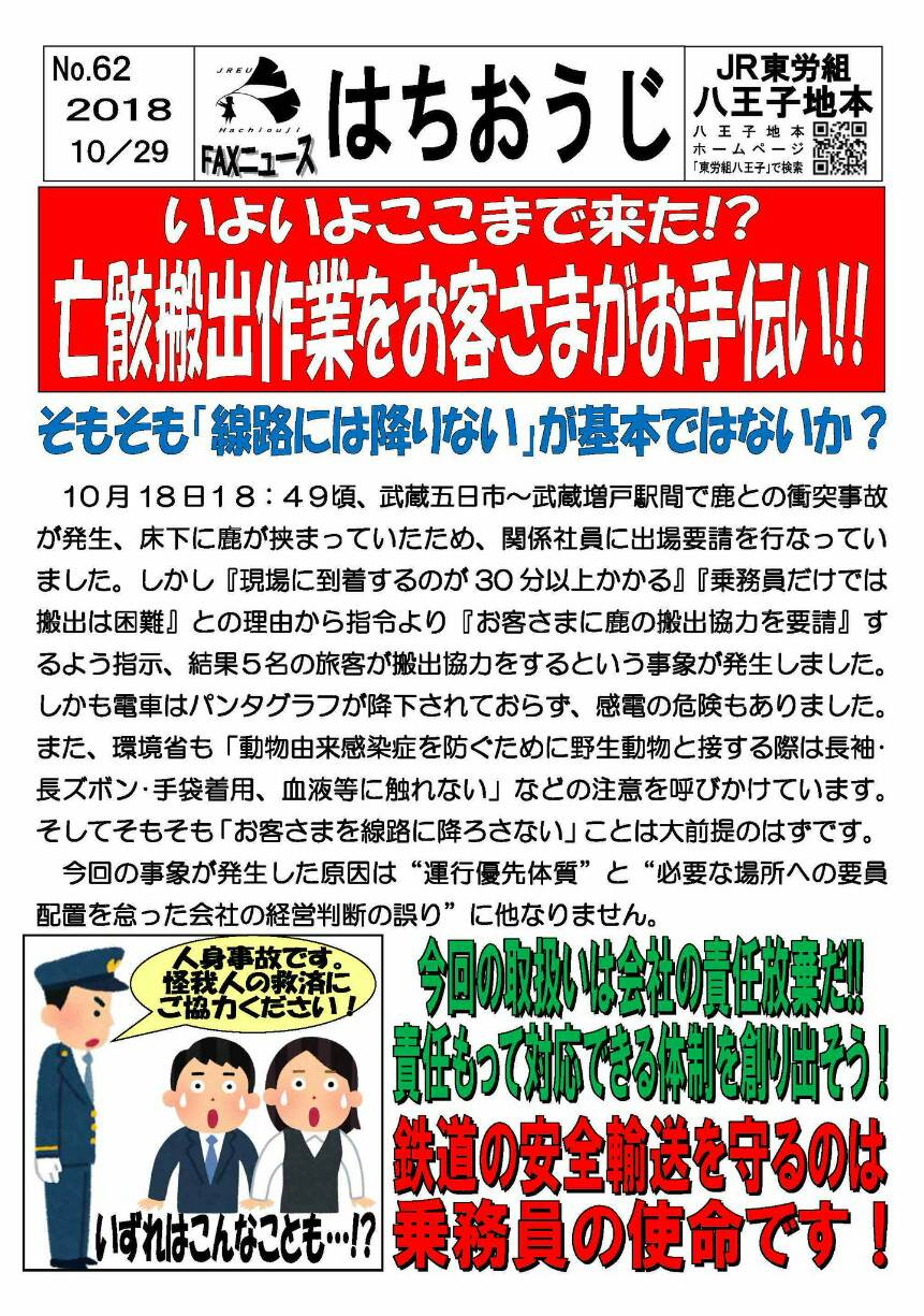 もうひとつ、郡山運輸区では、平成採の若い部分は東労組を抜けていますが、年輩を中心に30%くらいは残っています。他の運輸区でも会社の「社友会」に一旦入った青年が、今の状況をみて抜けることを助役に通告する動きもあります。