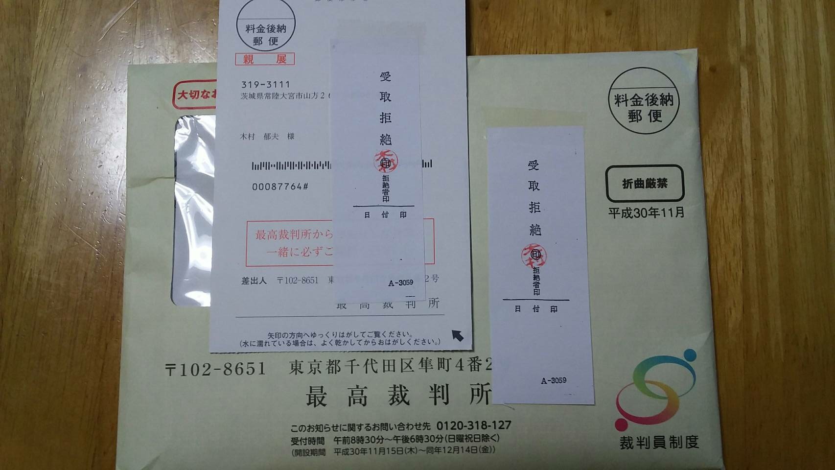 受け取りを拒否した裁判員の郵便物です。