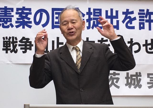 続いて呼びかけ人の水戸袴塚キリストの教会菊池牧夫牧師より「公明党はおかしい。かつての戦争で弾圧されてきたのは日蓮宗だったのではないか。それなのに改憲に賛成している」「これまで西川重則さんのもと100万人署名運動を進めてきたが、いよいよ本番の闘いとして頑張っていきたい」と語られた。
