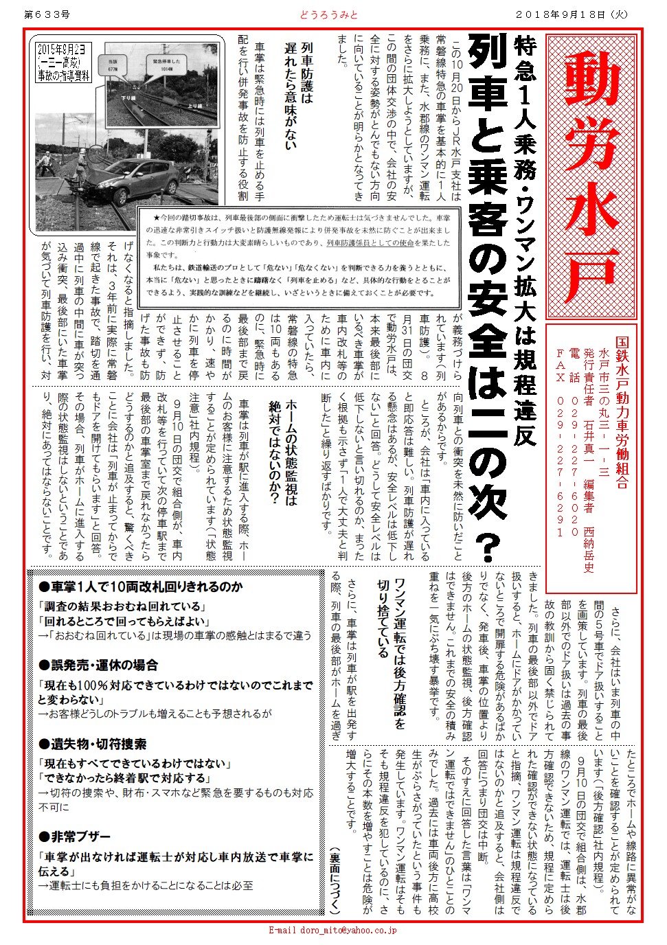 8月31日の団交で動労水戸は、本来最後部にいるべき車掌が車内改札等のために車内に入っていたら、常磐線の特急は10両もあるのに、緊急時に最後部まで戻るのに時間がかかり、速やかに列車を停止させることができず、防げた事故も防げなくなると指摘しました。それは、3年前に実際に常磐線で起きた事故で、踏切を通過中に列車の中間に車が突っ込み衝突、最後部にいた車掌が気づいて列車防護を行い、対向列車との衝突を未然に防いだことがあるからです。