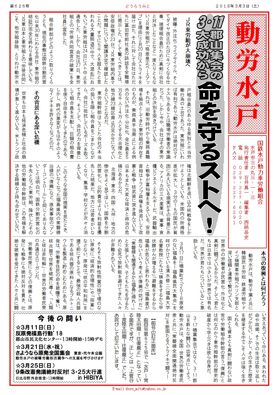 30年間の会社と東労組との癒着体制が崩壊しつつある今こそ、労働組合とは何なのか、その役割とは何なのかを、労働者一人ひとりが考える時が来ています。今こそ、動労水戸に加入し、共に闘いましょう。