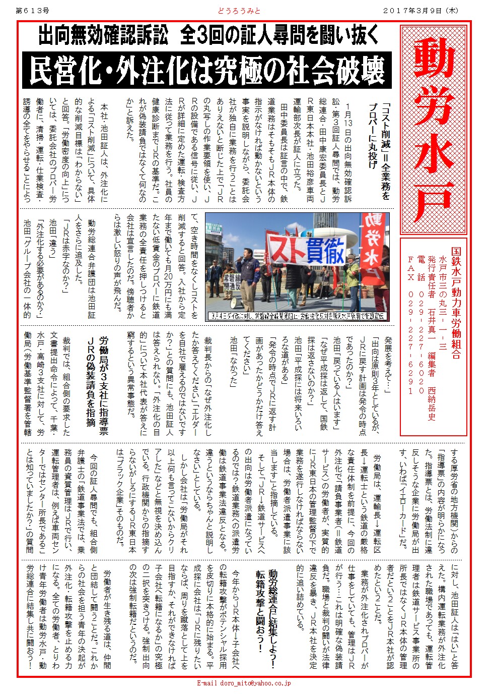 動労水戸・辻川慎一副委員長のエルダー再雇用をめぐる闘いは、再雇用申込書の提出期限である3月末を経過して闘われている。JRは発足以来、辻川副委員長をはじめとする組合員を売店やそば屋に分散隔離してきた。エルダー再雇用を期に再び組合員から一人だけ隔離しようとしている。勝田から水戸、たった一駅であろうとこのような団結破壊を認めることはできない。